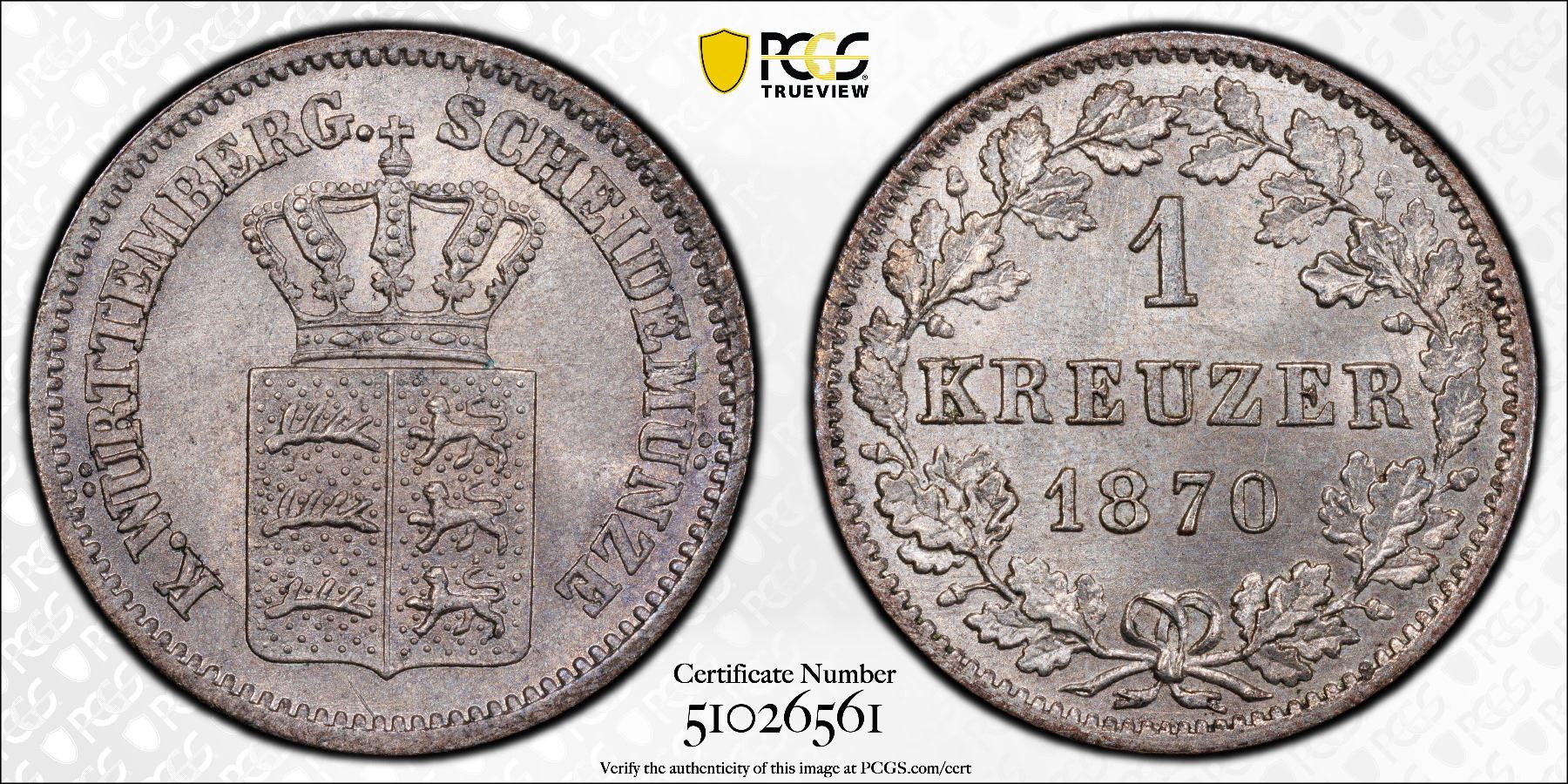 WÜRTTEMBERG: Karl I, 1864-1891, AR kreuzer, 1870, KM-612, J-82, AKS-128, a superb lustrous example! PCGS graded MS65.