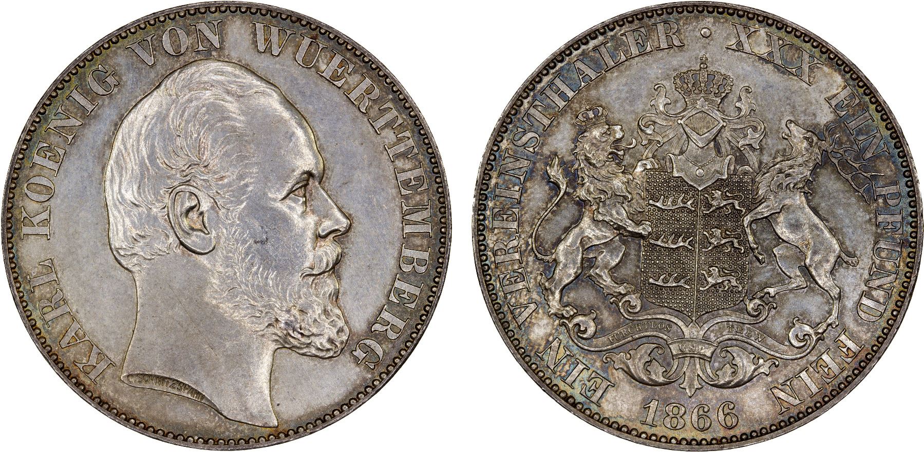 WÜRTTEMBERG: Karl I, 1864-1891, AR thaler, 1866, Choice About Unc