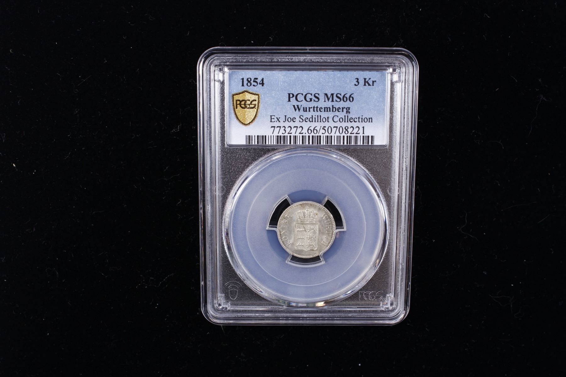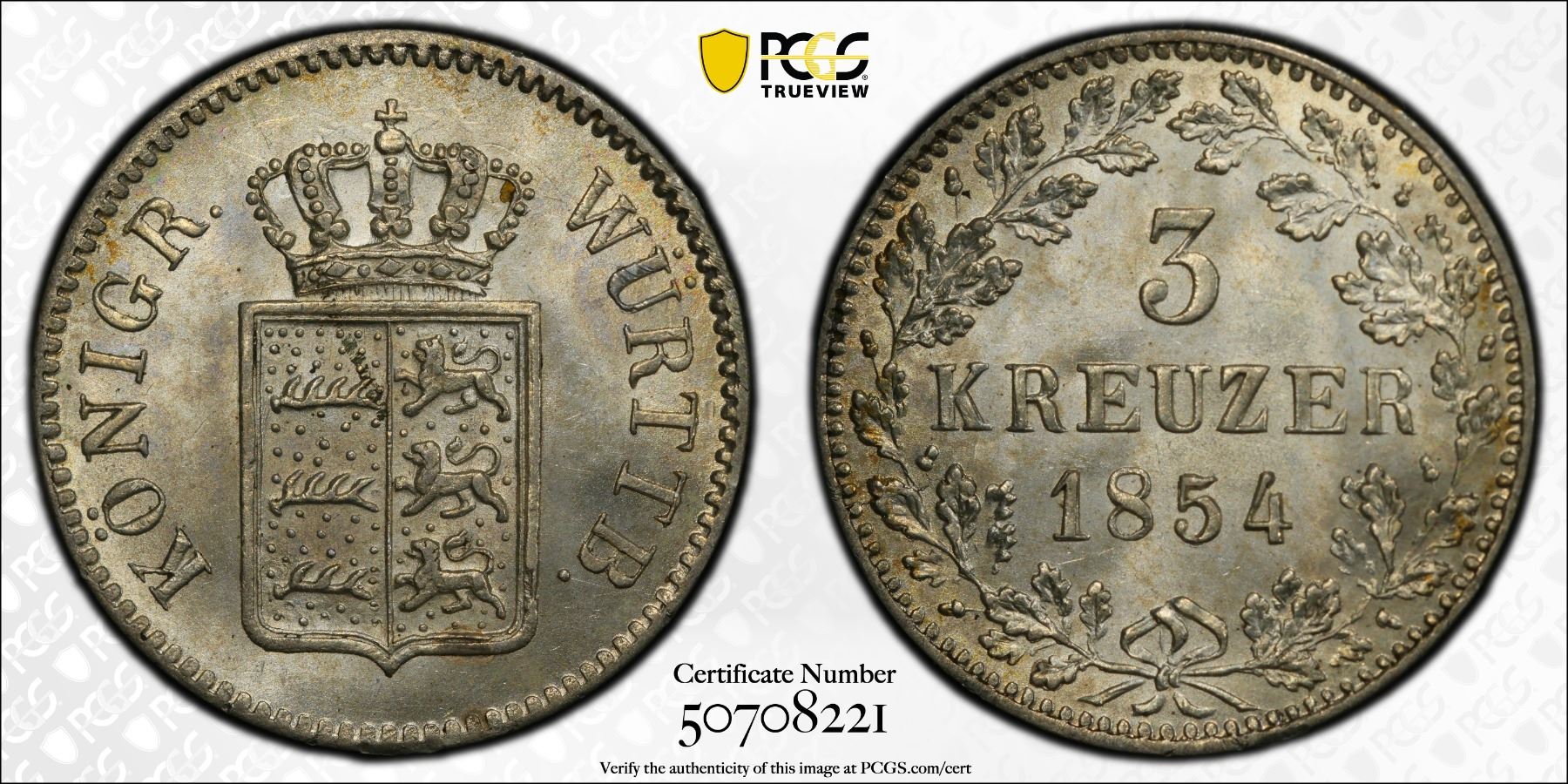 WÜRTTEMBERG: Wilhelm I, 1816-1864, AR 3 kreuzer, 1854, KM-591, a fantastic mint state example! PCGS graded MS66, ex Joe Sedillot Collection.
