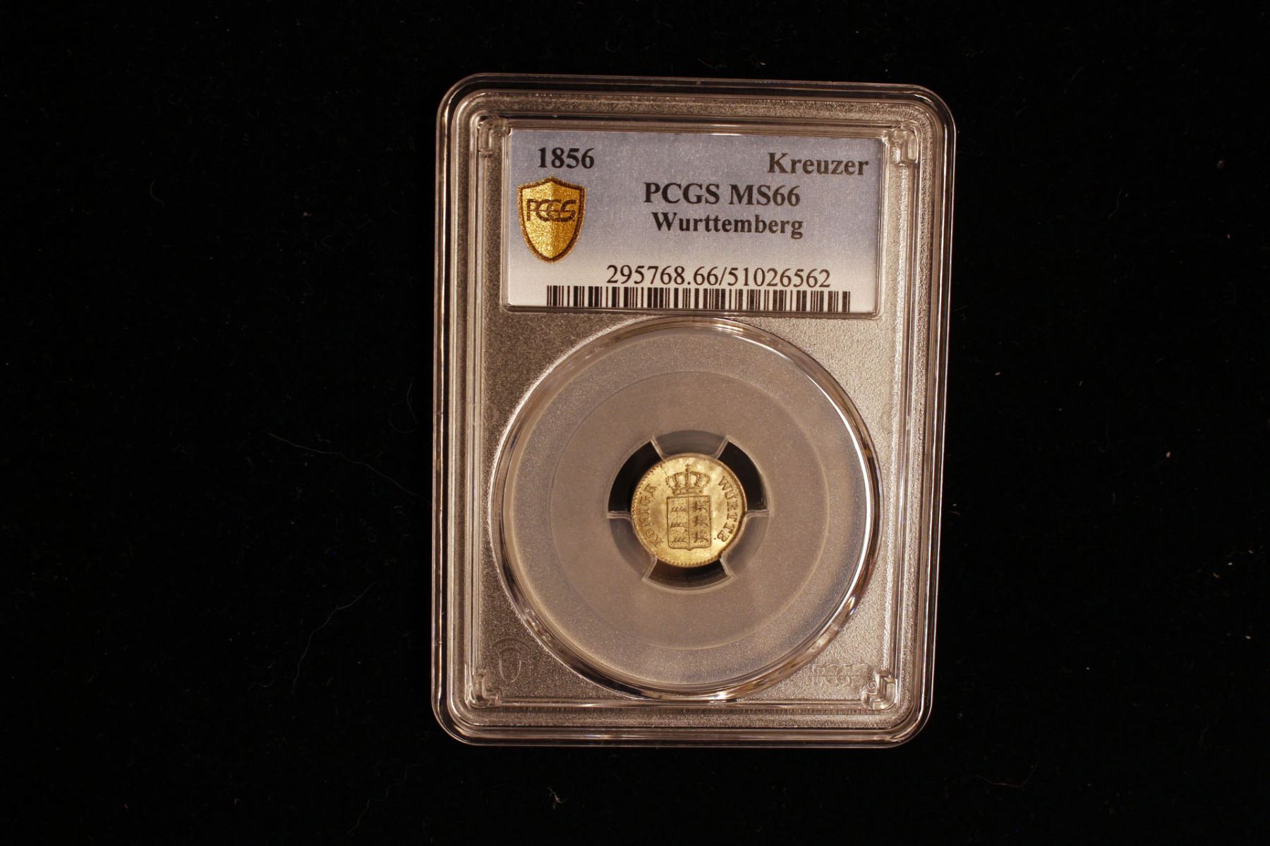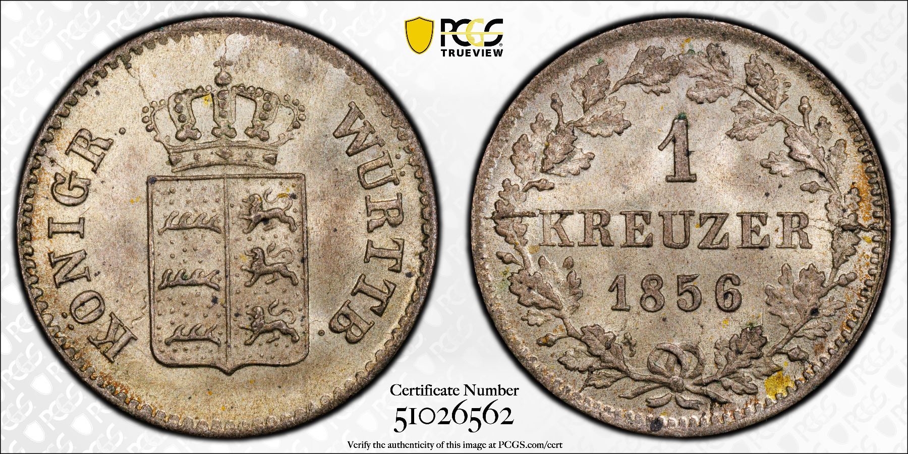 WÜRTTEMBERG: Wilhelm I, 1816-1864, AR kreuzer, 1856, KM-590, J-66, AKS-110, a fantastic lustrous example! PCGS graded MS66.