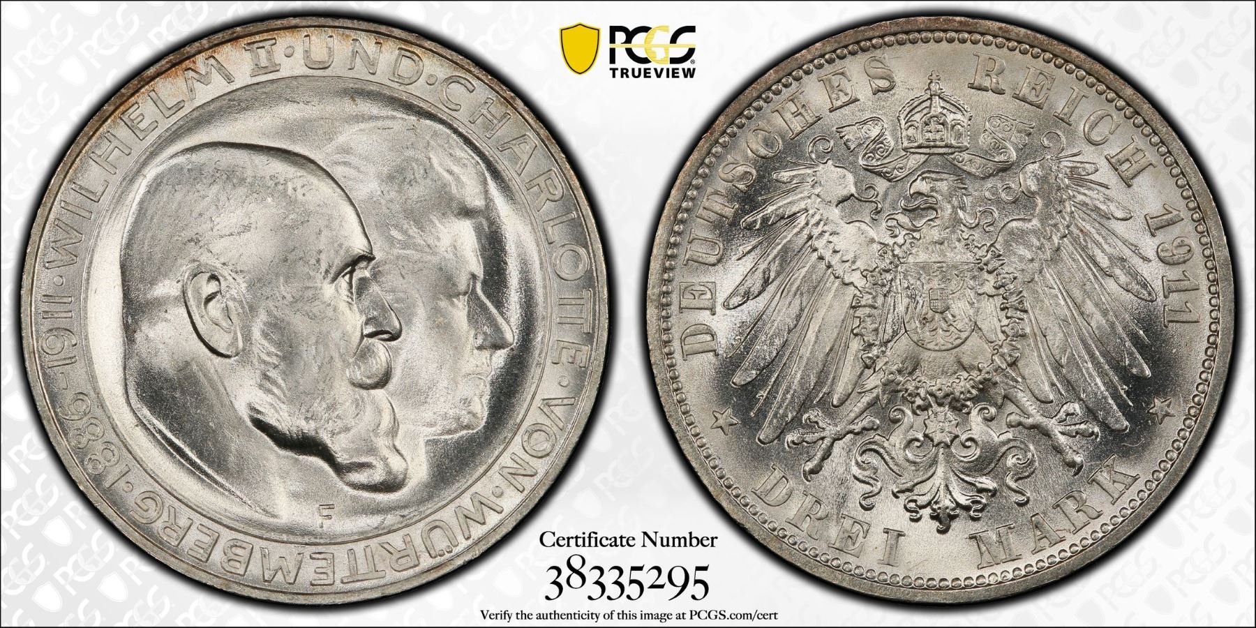 WÜRTTEMBERG: Wilhelm II, 1891-1918, AR 3 mark, 1911-F, KM-636, J-177a, Silver Wedding Anniversary, variety with the H in Charlotte in the middle of the bar, PCGS graded MS64.
