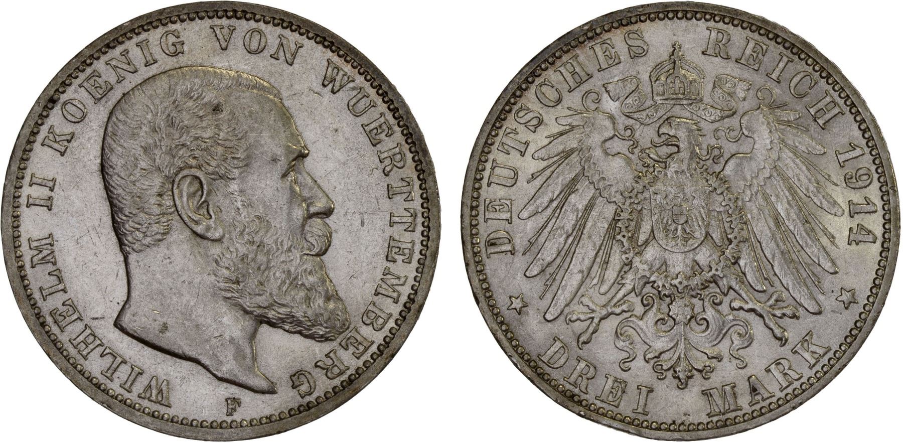 WÜRTTEMBERG: Wilhelm II, 1891-1918, AR 3 mark, Freudenstadt, 1914-F, AU