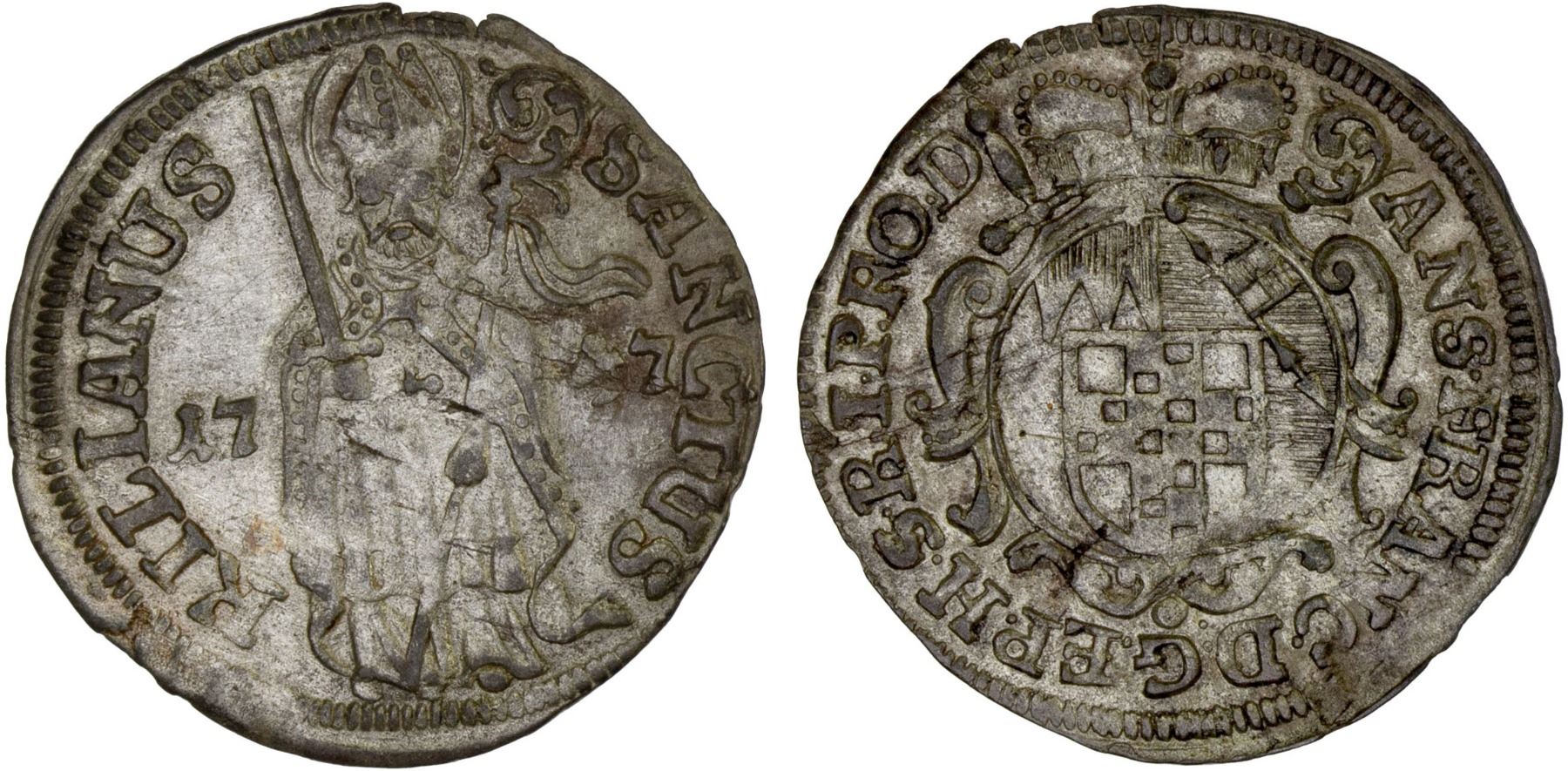 WÜRZBURG: Anselm Franz, 1746-1749, AR schilling (6 neue pfennige), 1747, KM-318, St. Killian, somewhat crude, two-year type, XF, ex Almer H. Orr III Collection.