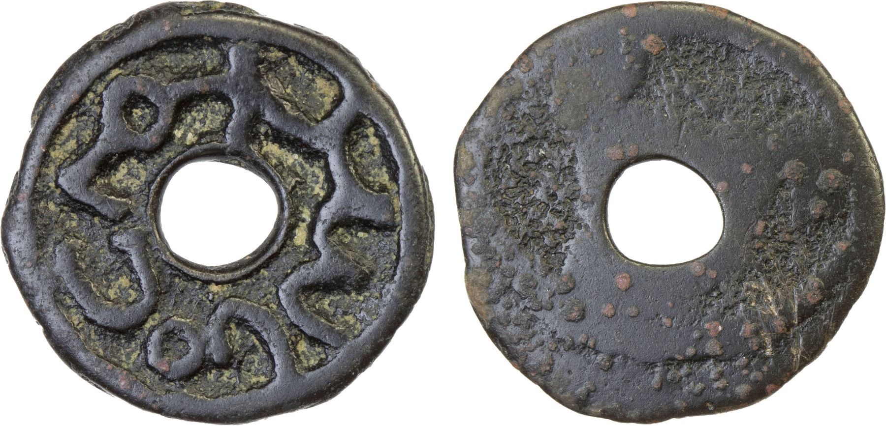 WAKHSH VALLEY: Anonymous, ca. 7th-9th century, AE cash (2.01g), cf. Zeno-182879, round central hole, undeciphered legend in stylized Sogdian script, blank reverse, bold VF, RR. A similar piece was sold in our Auction 54, lot 128.