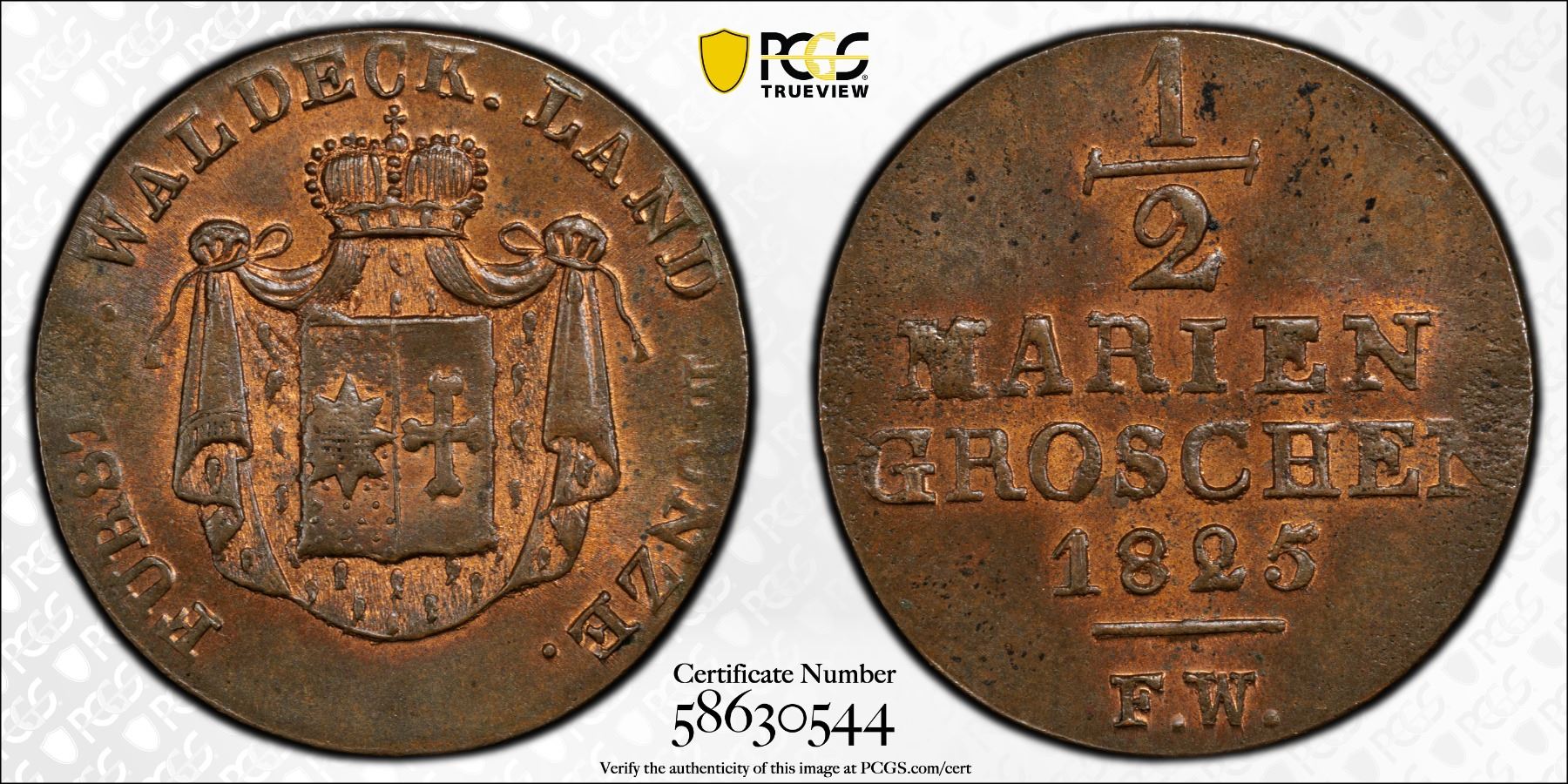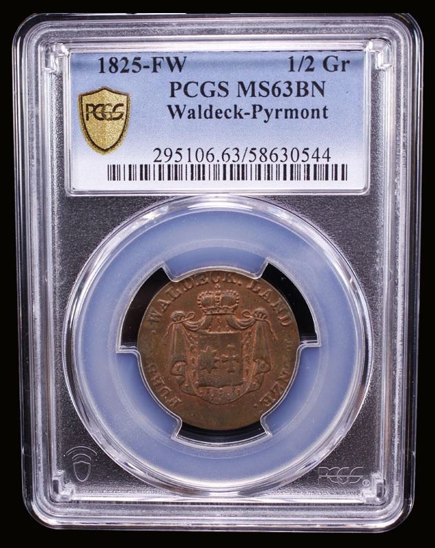 WALDECK-PYRMONT: Georg Friedrich Heinrich, 1813-1845, AE 1/2 groschen, Arolsen, 1825, PCGS MS63 BN