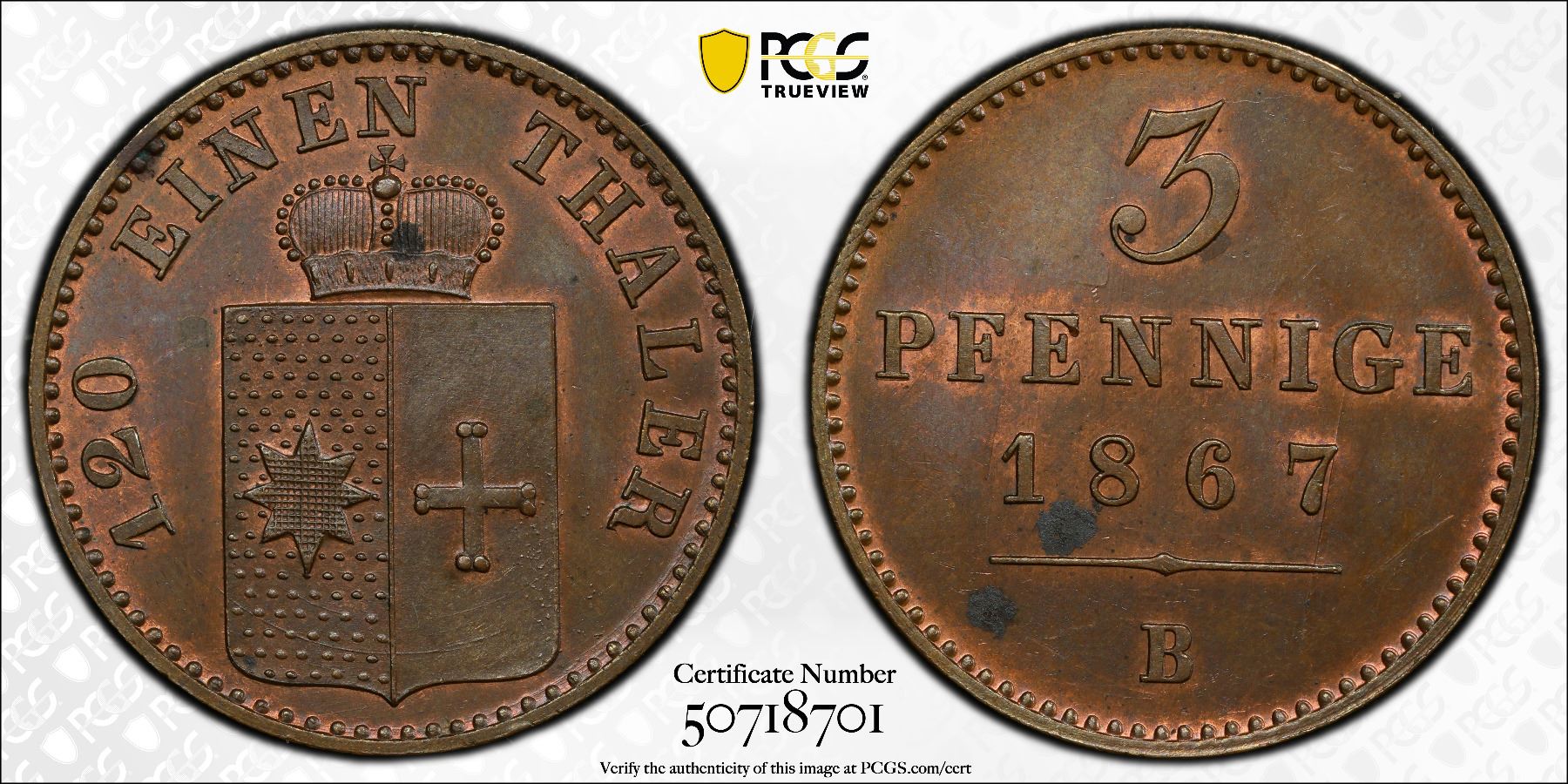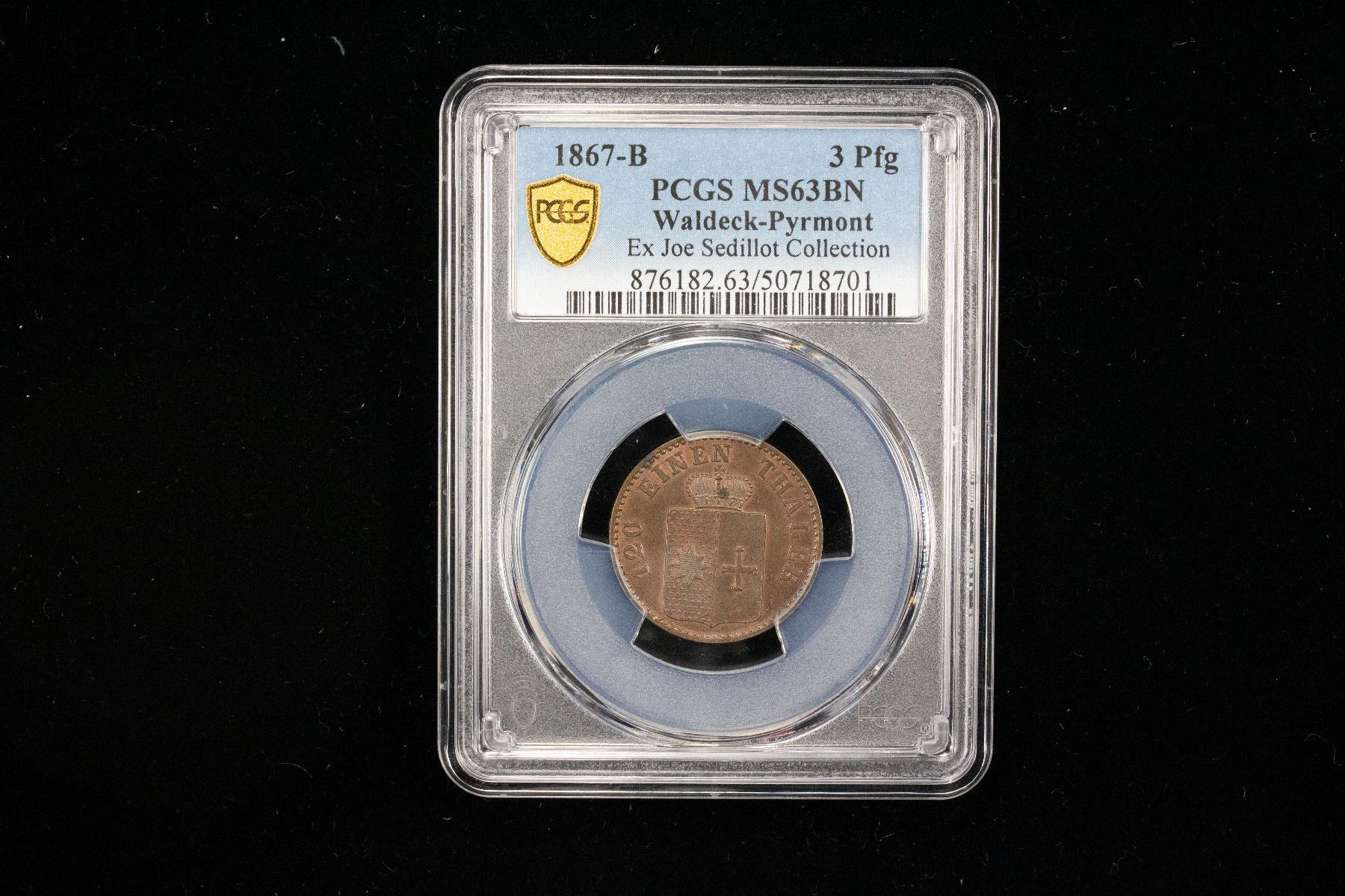 WALDECK-PYRMONT: George Victor, 1845-1893, AE 3 pfennig, 1867-B, KM-171.2, C-86.1, a lovely lustrous chocolate brown mint state example! PCGS graded MS63 BN, ex Joe Sedillot Collection. In 1867, Waldeck-Pyrmont joined the North German Confederation and signed a military agreement with Prussia, marking a major step toward German unification. It kept its formal independence but increasingly fell under Prussian influence.