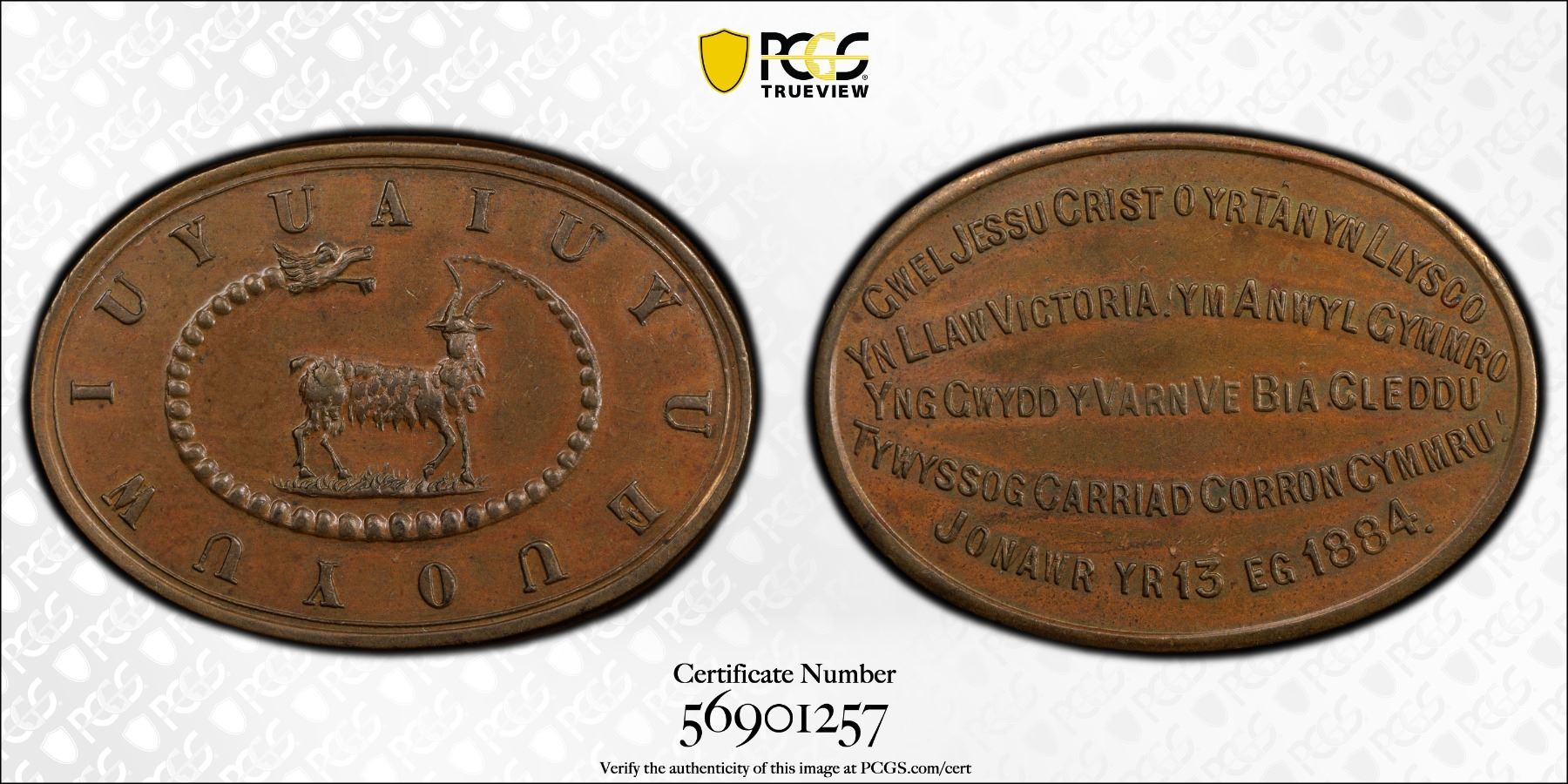 WALES: AE medalet, 1884, 37x26mm bronze medalet, The Cremation of Iesu Christ; Goat standing right, head facing, with serpent; Welsh letters around, IUYUAIUYUEUOYUW // legend in Welsh language, "GWEL JESSU CRIST O YRTAN YN LLYSCO / YN LLAW VICTORIA YM ANWYL CYMMRO / YNG GWYDD Y VARN VE BIA CLEDDU / TYWYSSOG CARRIAD CORRON CYMMRU / JONAWR YR 13 EG 1884", rare, a lovely chocolate-brown mint state example! PCGS graded MS63 BN. William Price (1800-1893) was a Welsh physician and political activist best known for his support of Welsh nationalism, Chartism and involvement with the Neo-Druidic religious movement. Historians have characterized Price as one of the most significant figures in Wales during the Victorian era.On January 13, 1884, William Price, a medical doctor, socio-political activist and druid, cremated the body of his infant son, Iesu Christ, on a hill near Llantrisant, Wales, causing an outrage and the intervention of local police officers who dragged the corpse from the burning pyre. Price successfully defeated the charges brought against him, convincing the judge that cremation was not illegal. The case set a precedent allowing for the beginning of officially sanctioned cremation in Great Britain. This medal was one of 300 struck by Price to commemorate his victory.