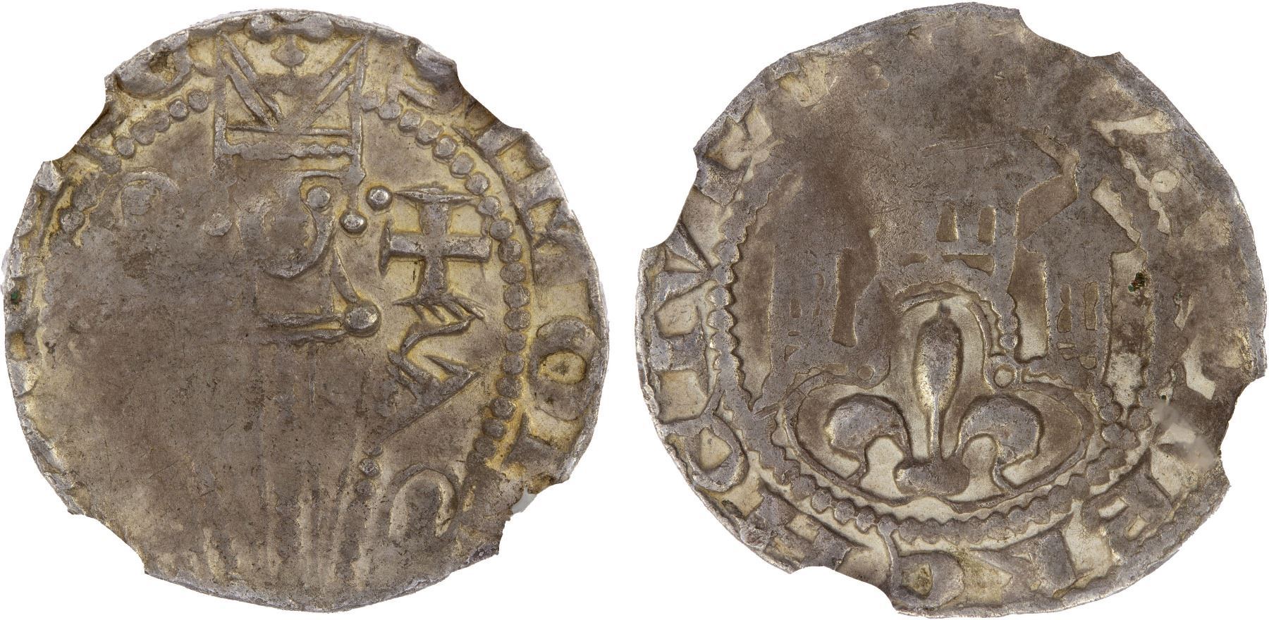 WARBURG: Simon of Lippe, bishop, 1247-1277, AR pfennig (1.35g), Weingärtner-35, half-length bust in episcopal regalia facing, holding crozier and cross, SIMON - [EP]ISC // three towers, lily in trefoil below, WARTBRCH CIVITAS, minor weakness, NGC graded AU53.