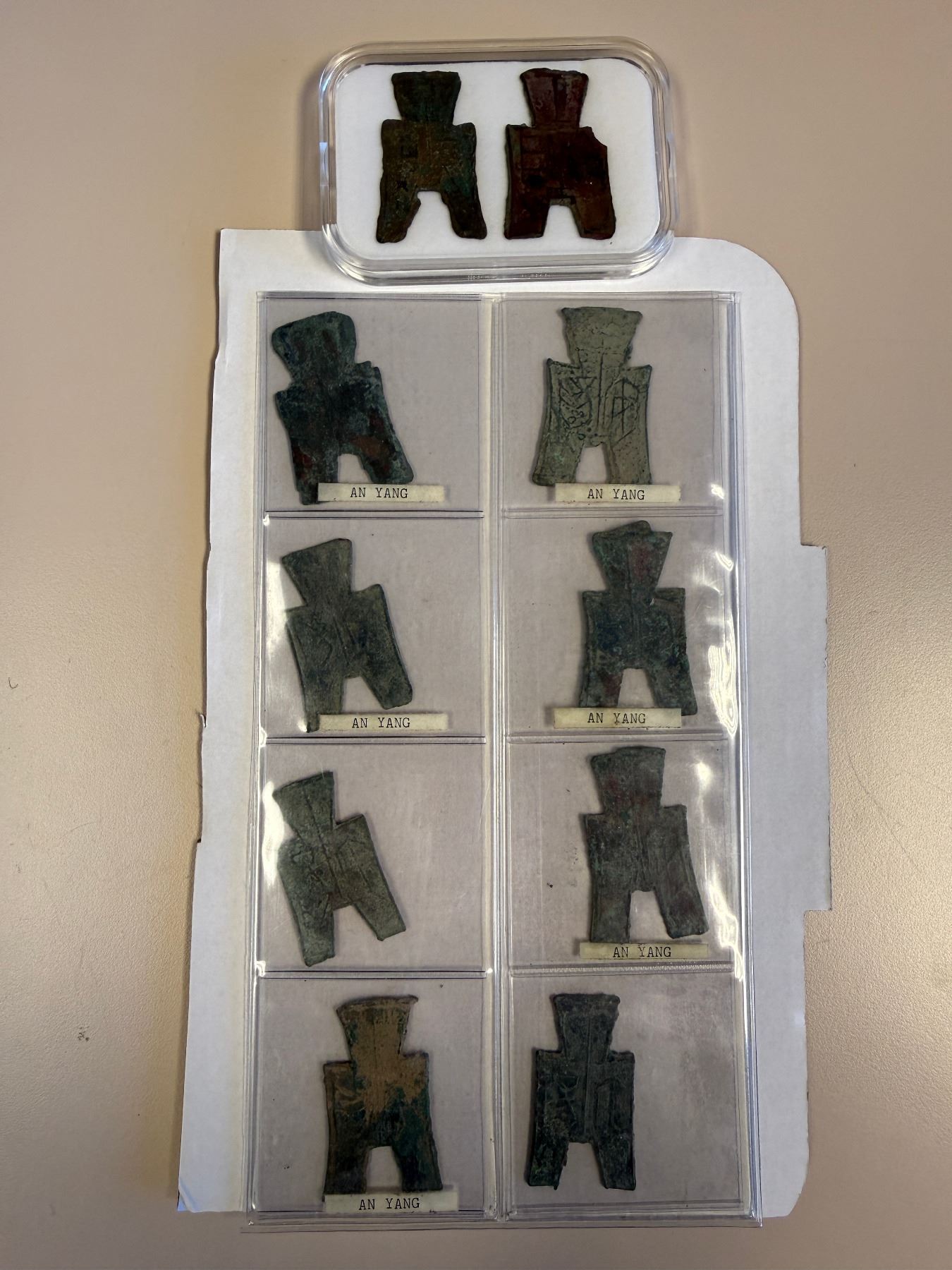WARRING STATES: LOT of 10 coins, State of Yan, 350-250 BC, AE spade money, flat-handle square-foot spade type, an yang in archaic script (8), small-size flan, plus two other spades, one broken, overall a very nice selection of mostly An Yang types, average quality condition, retail value $750, lot of 10 coins.