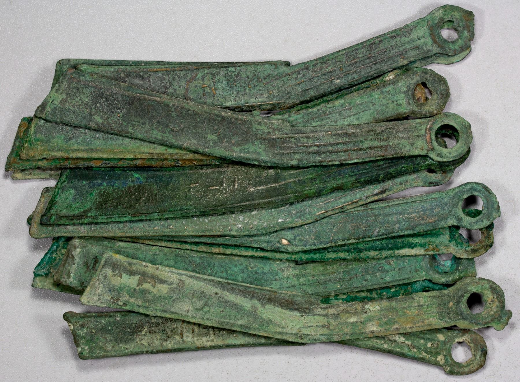 WARRING STATES: LOT of 16 knives, State of Yan, ming dao "knife money", cast 400-220 BC, average quality examples, a nice selection and many with clear reverse characters, retail value $1000, lot of 16 coins. Ming knives take their name from the character on the obverse, which has traditionally been read as ming but other proposals have been yi, ju, méng, and zhao. A mint for Ming knives was unearthed at Xiadu, to the southwest of Beijing. This was the site of Yi, capital of the State of Yan from 360 BC, so the reading of yi has found favor recently. Molds have also been discovered in Shandong Province.
