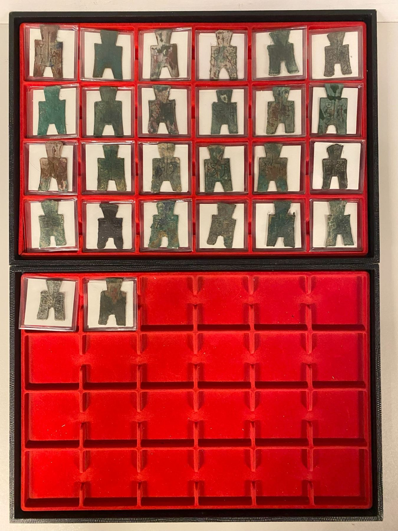 WARRING STATES: LOT of 26 AE spade money, all square foot spades, including 3 Chang Zi (H-3.202ff), 1 Liang (H-3.226), 11 Ping Yang (H-3.355ff), 2 Ping Yin (H-3.366), 6 Xiang Ping (H-3.401), 1 Xiang Yuan (H-3.403), 1 Zi Cheng (H-3.437), plus an unattributed example; average Fine to VF conditions, four broken and repaired; retail value $650, lot of 26 pieces, ex Dr. Dirk Löer Collection, ex Bernd Löer Collection.