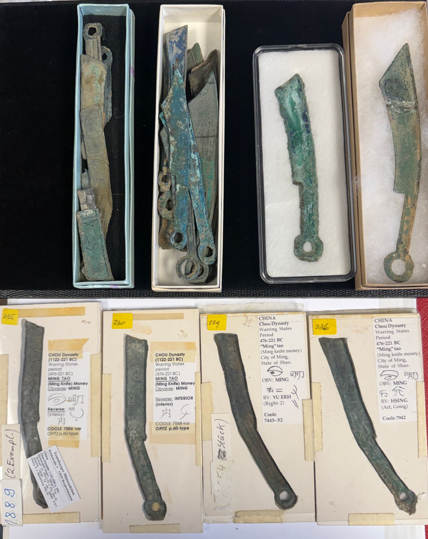 WARRING STATES: LOT of 28 knife money, various types, including 8 pointed-tip type (two with damaged loop, two others broken and repaired), 4 straight-edge type (one H-4.67 with bold Gan Dan, i.e. Handan), 12 Ming knives (one repaired, four broken), 3 needle-tip type (one with chipped tip), and a smaller Boshan-style knife (cf. obverse of H-4.45, 132mm); most with average to decent patina, some with clear characters, others with moderate corrosion; retail value $450, lot of 28 pieces, ex Dr. Dirk Löer Collection.