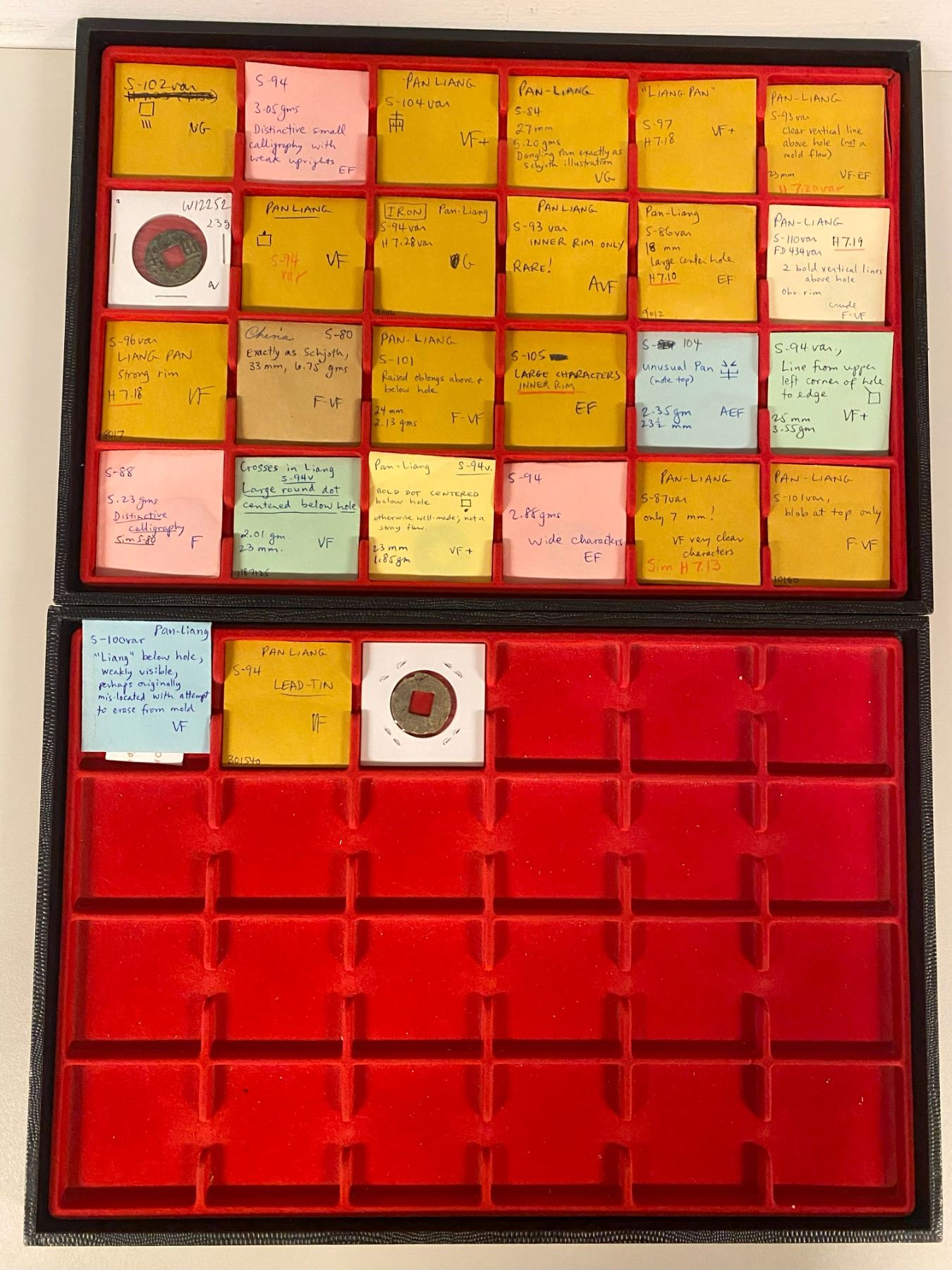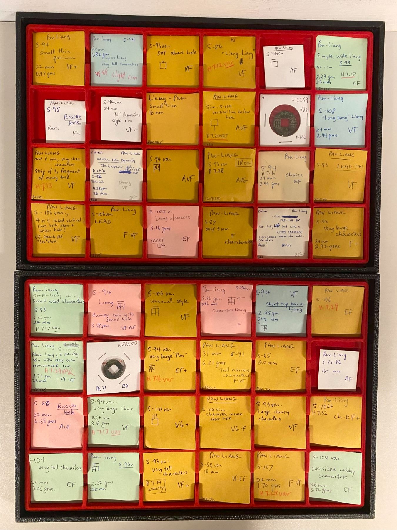 WARRING STATES: LOT of 61 coins, an collection of ancient ban liang coins including many varieties, some quite scarce, all worked up in paper 2x2 holders with collector's attribution on each holder, average quality examples, retail value $700, lot of 73 coins, ex Dr. Dirk Löer Collection. The Ban Liang coinage was the first unified currency in imperial Chinese history, first minted as early as 378 BC. It was round with a square hole in the middle. Before that date, a variety of coins were used in China, usually in the form of blades (knife money, spade money) or other implements, though round coins with square holes were used by the state of Zhou before it was extinguished by Qin in 249 BC. The Ban Liang corresponds to a half tael, or twelve zhu, and It typically weighs between ten and six grams. The standardization of currency with this round coinage was part of a broader plan to unify weights and measures during the Qin Empire. Ban Liang coins continued to be used under the Western Han dynasty until they were finally replaced by the Wu Zhu cash coins in 118 BC.