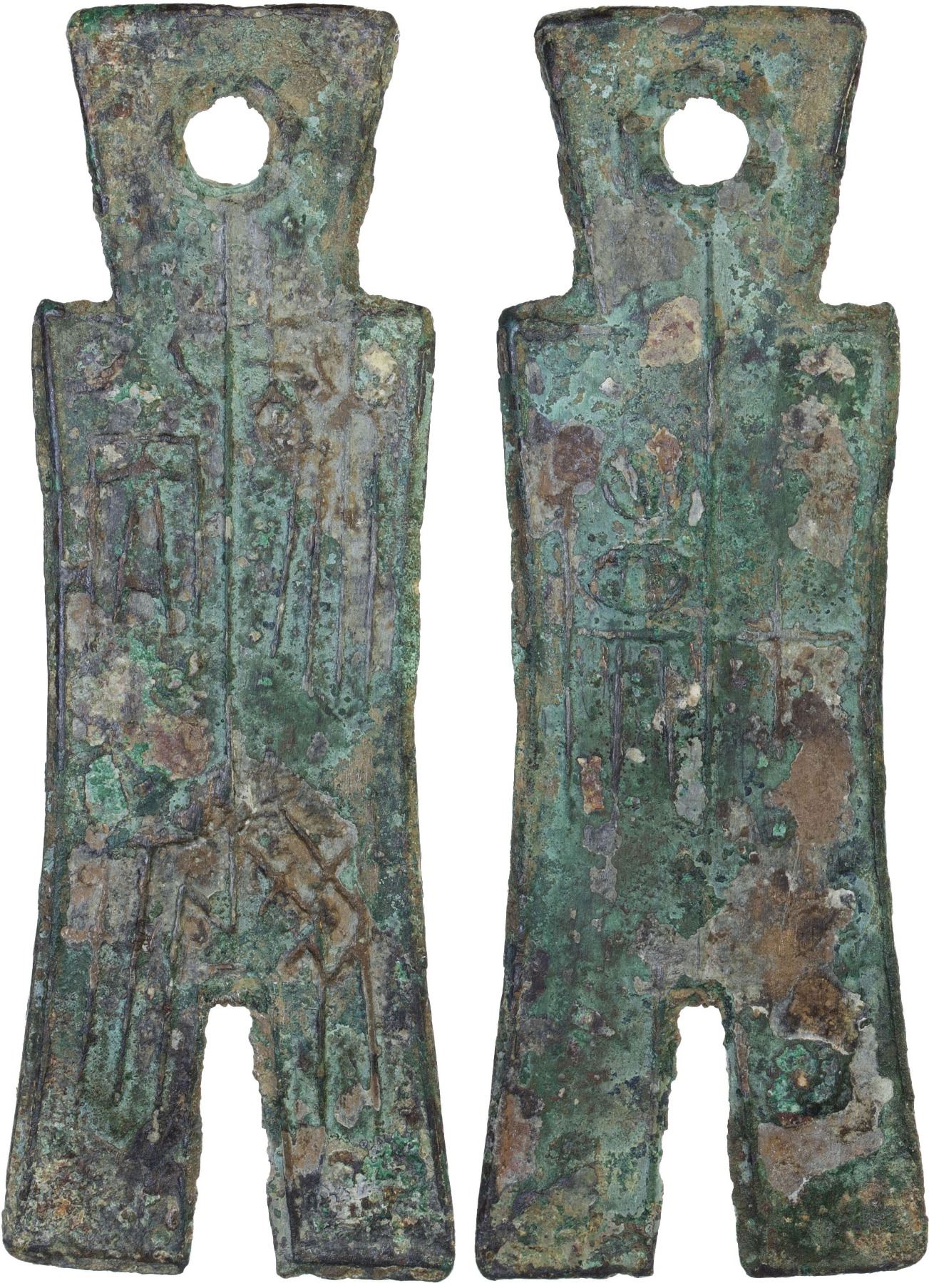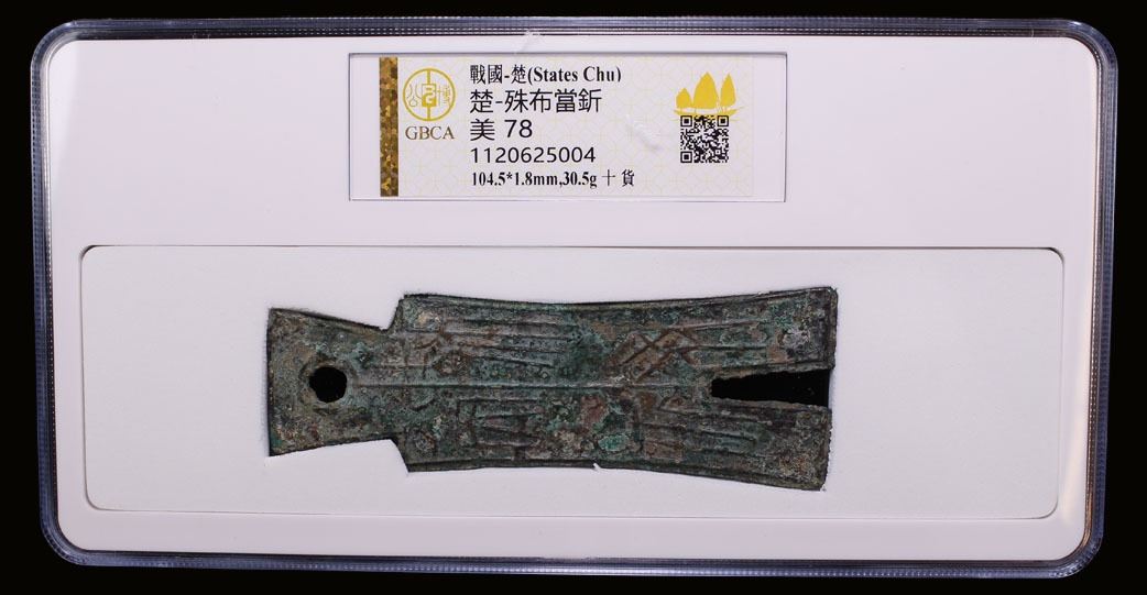 WARRING STATES: State of Chu, 400-300 BC, AE spade money (30.5g), H-3.470, Dan Jin square-foot type, pei bi dang jin ("pei coin equivalent to one jin") on obverse, shi huo ("currency of [value] ten") on reverse in archaic script, graded 78 by GBCA Grading Company, F-VF, ex Dr. Dirk Löer Collection. The State of Chu was an ancient Chinese state in the Yangtze valley during the Zhou Dynasty. Originally Chu was considered a viscountcy, but starting from King Wu in the early 8th century BC, the rulers of Chu declared themselves kings on an equal footing with the Zhou rulers. Originally known as Jing and then as Jingchu, Chu occupied vast areas of land at its height, including most of the present-day provinces of Hubei and Hunan, along with parts of Chongqing, Guizhou, Henan, Anhui, Jiangxi, Jiangsu, Zhejiang, and Shanghai. The hao in the reverse inscription shi hao probably refers to ten ant-nose type coins. These spades are thick and robust with well-developed rims all the way around, with a large round hole in the top.