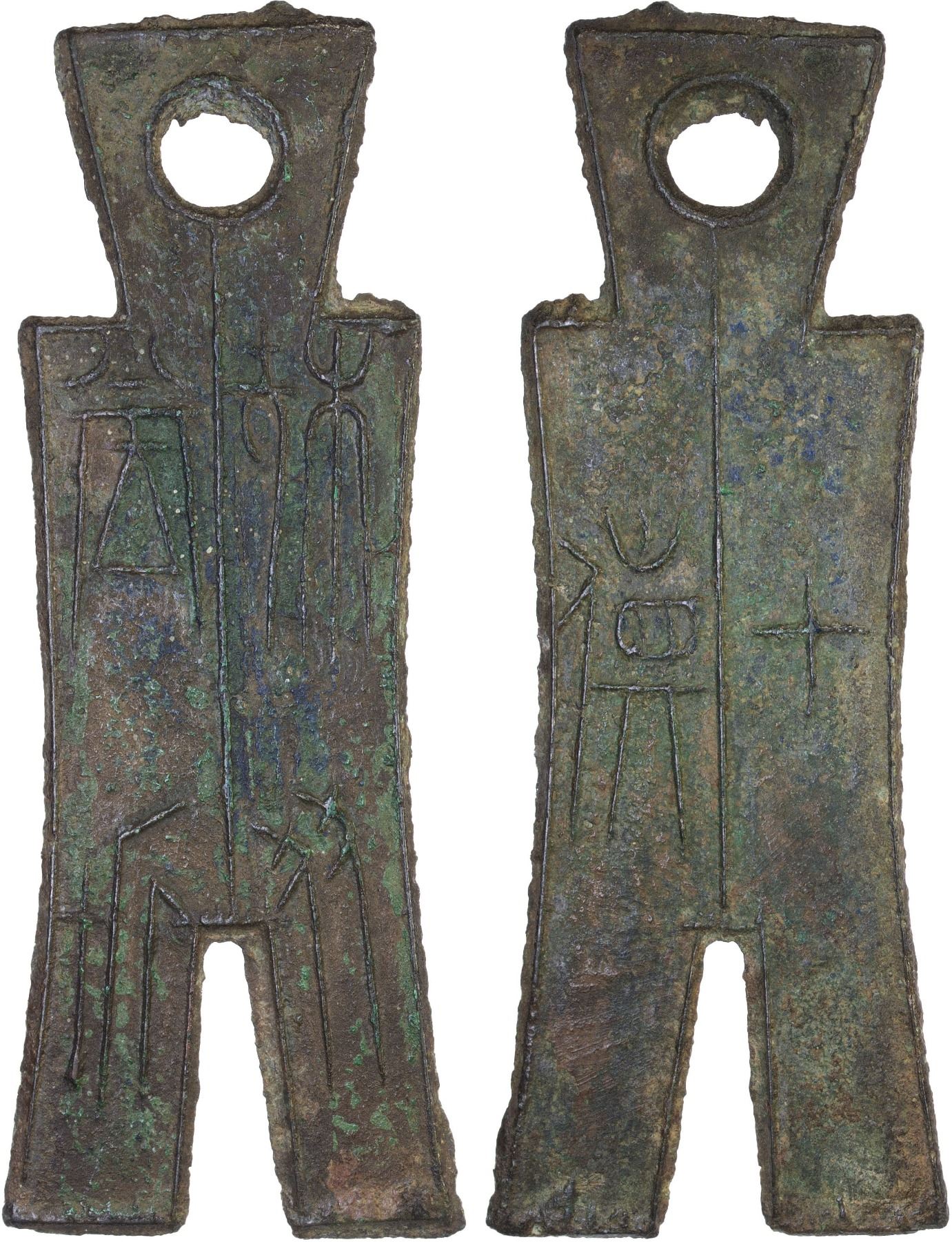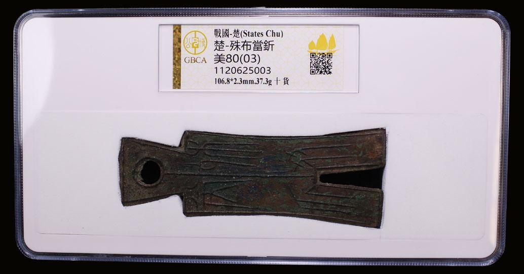 WARRING STATES: State of Chu, 400-300 BC, AE spade money (37.3g), H-3.470, Dan Jin square-foot type, pei bi dang jin ("pei coin equivalent to one jin") on obverse, shi huo ("currency of [value] ten") on reverse in archaic script, graded 80(03) by GBCA Grading Company, repaired, ex Dr. Dirk Löer Collection. The State of Chu was an ancient Chinese state in the Yangtze valley during the Zhou Dynasty. Originally Chu was considered a viscountcy, but starting from King Wu in the early 8th century BC, the rulers of Chu declared themselves kings on an equal footing with the Zhou rulers. Originally known as Jing and then as Jingchu, Chu occupied vast areas of land at its height, including most of the present-day provinces of Hubei and Hunan, along with parts of Chongqing, Guizhou, Henan, Anhui, Jiangxi, Jiangsu, Zhejiang, and Shanghai. The hao in the reverse inscription shi hao probably refers to ten ant-nose type coins. These spades are thick and robust with well-developed rims all the way around, with a large round hole in the top.