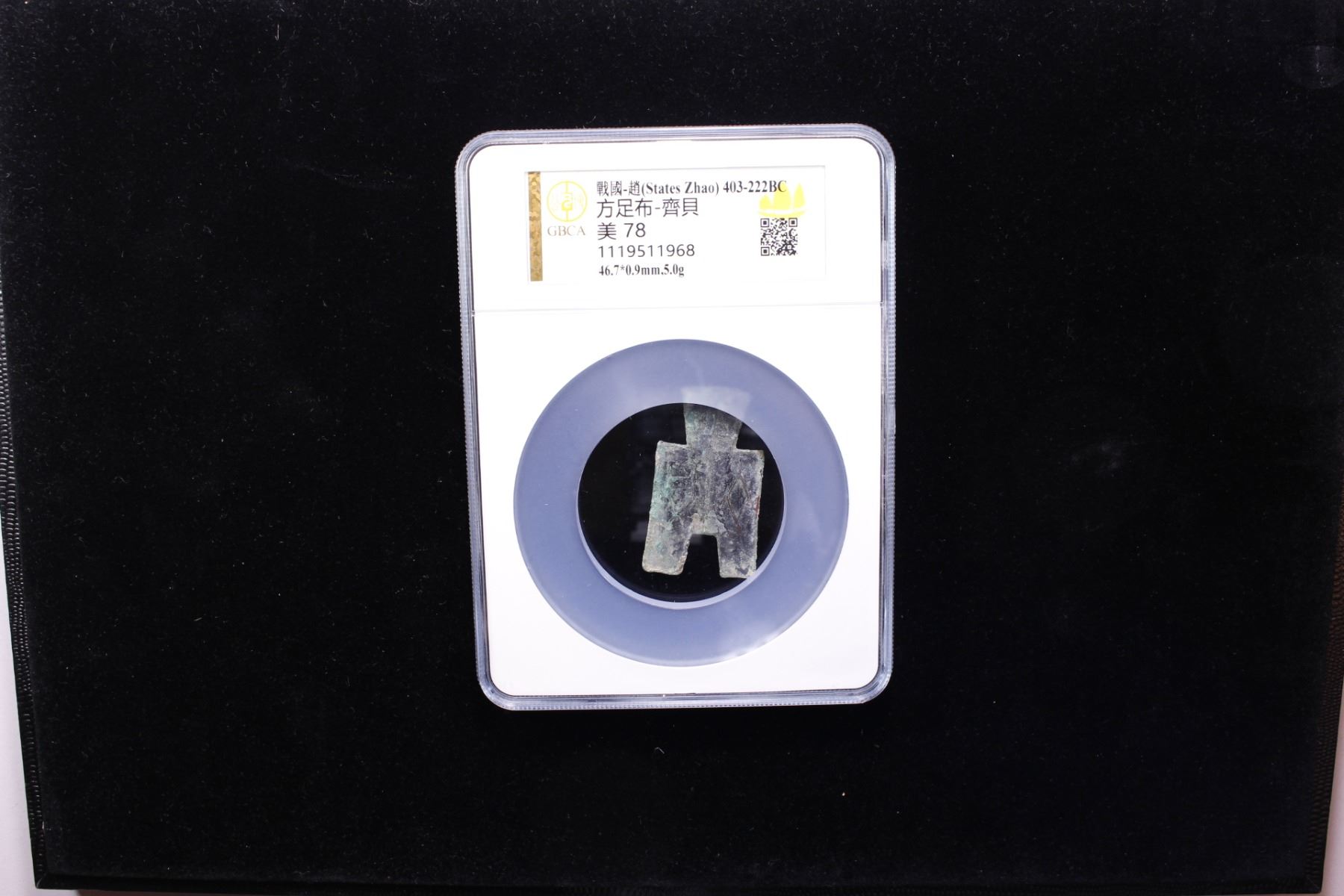 WARRING STATES: State of Han, 350-250 BC, AE spade money (5g), H-3.373, flat-handlef square-foot spade type, qi bei in archaic scrip, graded 78 by GBCA Grading Company, Fine, ex Dr. Dirk Löer Collection.