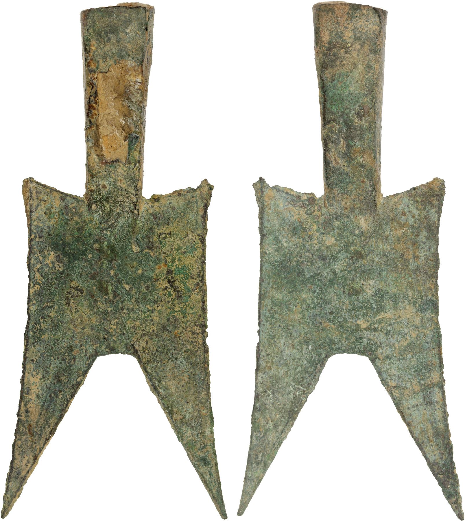 WARRING STATES: State of Jin, 500-400 BC, AE spade money (22.7g), H-2.182, hollow-handled pointed shoulder type, without inscription, graded 'Genuine' by GBCA Grading Company, usual green and light brown patina, VF, ex Dr. Dirk Löer Collection. This type of spade has pointed shoulders and feet and a long hollow handle. There are three parallel lines on the obverse and reverse with occasional inscriptions. They are found in Northeast Henan and Shanxi Provinces, the territory of the Duchy of Jin, later to become the State of Zhao. They are held to be somewhat later in date than the square-shouldered spades. Their shape seems to be designed for ease of tying together in bundles, rather than deriving from any particular agricultural instrument.