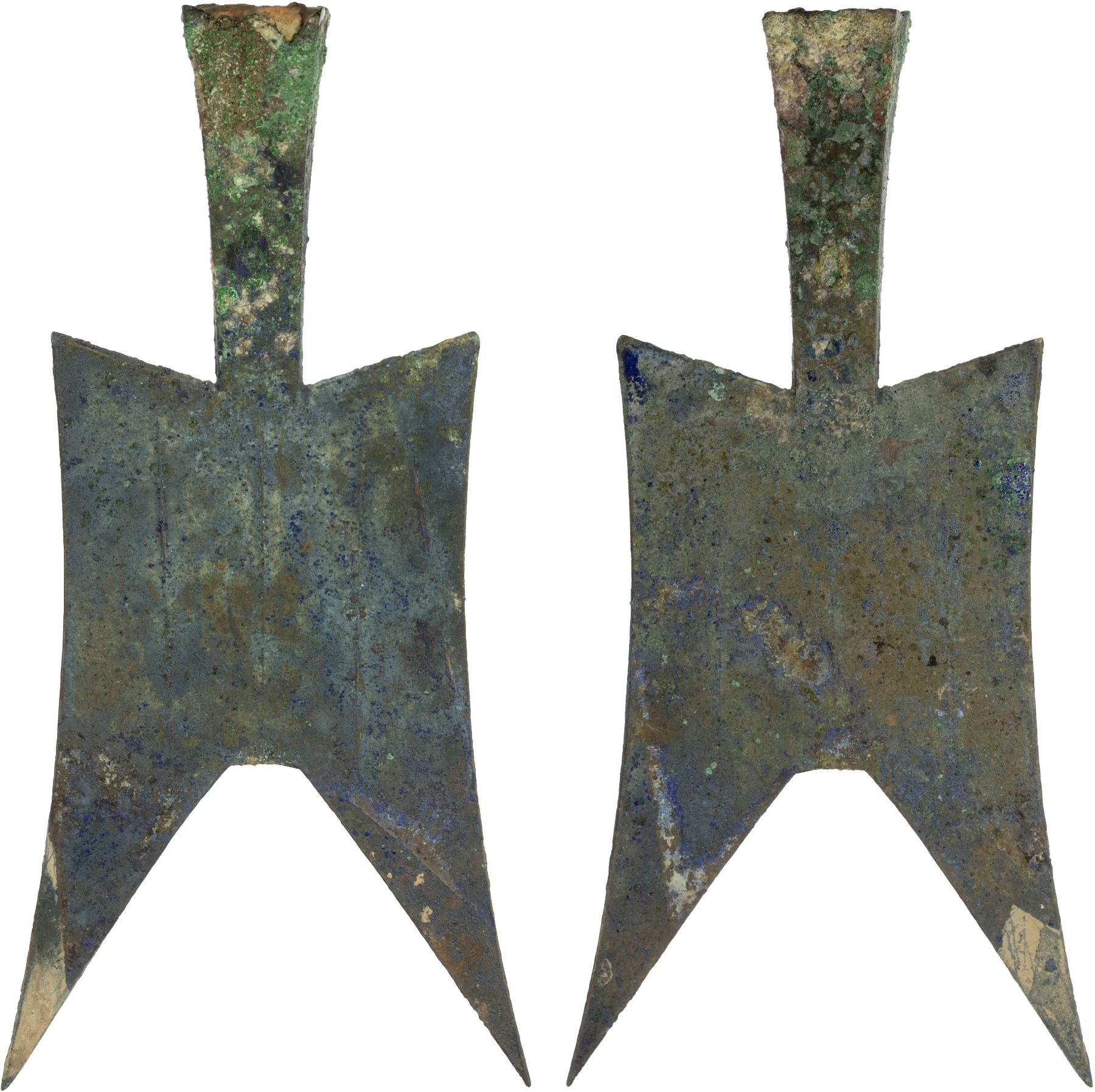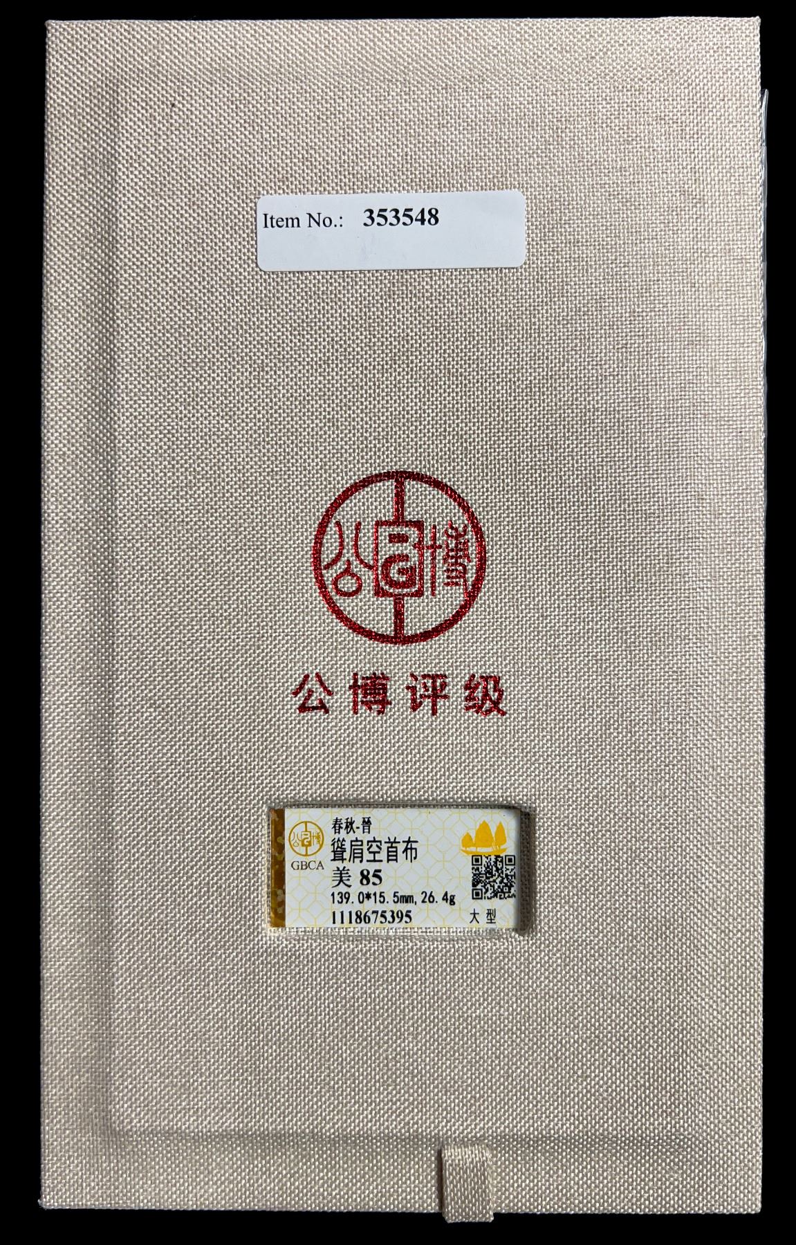 WARRING STATES: State of Jin, 500-400 BC, AE spade money (26.4g), H-2.181, hollow-handled pointed shoulder type, large unscribed variety, a superb example with green and brown patina, graded 85 by GBCA Grading Company, VF, ex Dr. Dirk Löer Collection. Spades of this type are found in Northeast Henan and Shanxi, the territory of the Duchy of Jin, later to become Zhao. They are held to be somewhat later in date than the square shouldered spades. Their shape seems to be designed for ease of tying together in bundles, rather than deriving from any particular agricultural instrument.