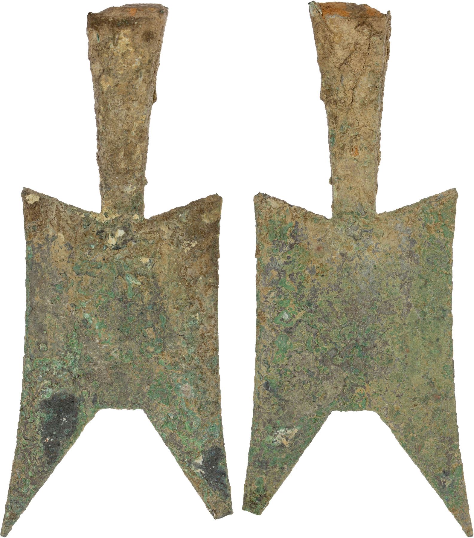 Spades of this type are found in Northeast Henan and Shanxi, the territory of the Duchy of Jin, later to become Zhao. They are held to be somewhat later in date than the square shouldered spades. Their shape seems to be designed for ease of tying together in bundles, rather than deriving from any particular agricultural instrument.