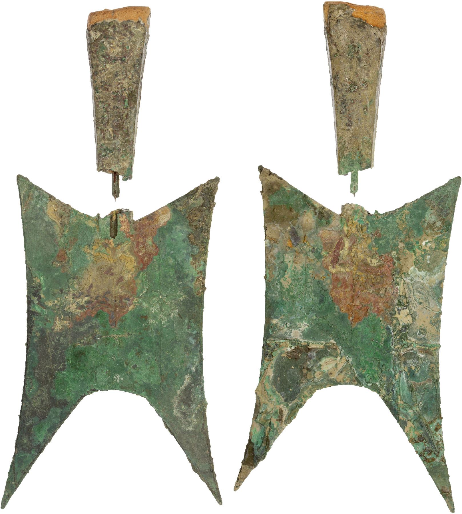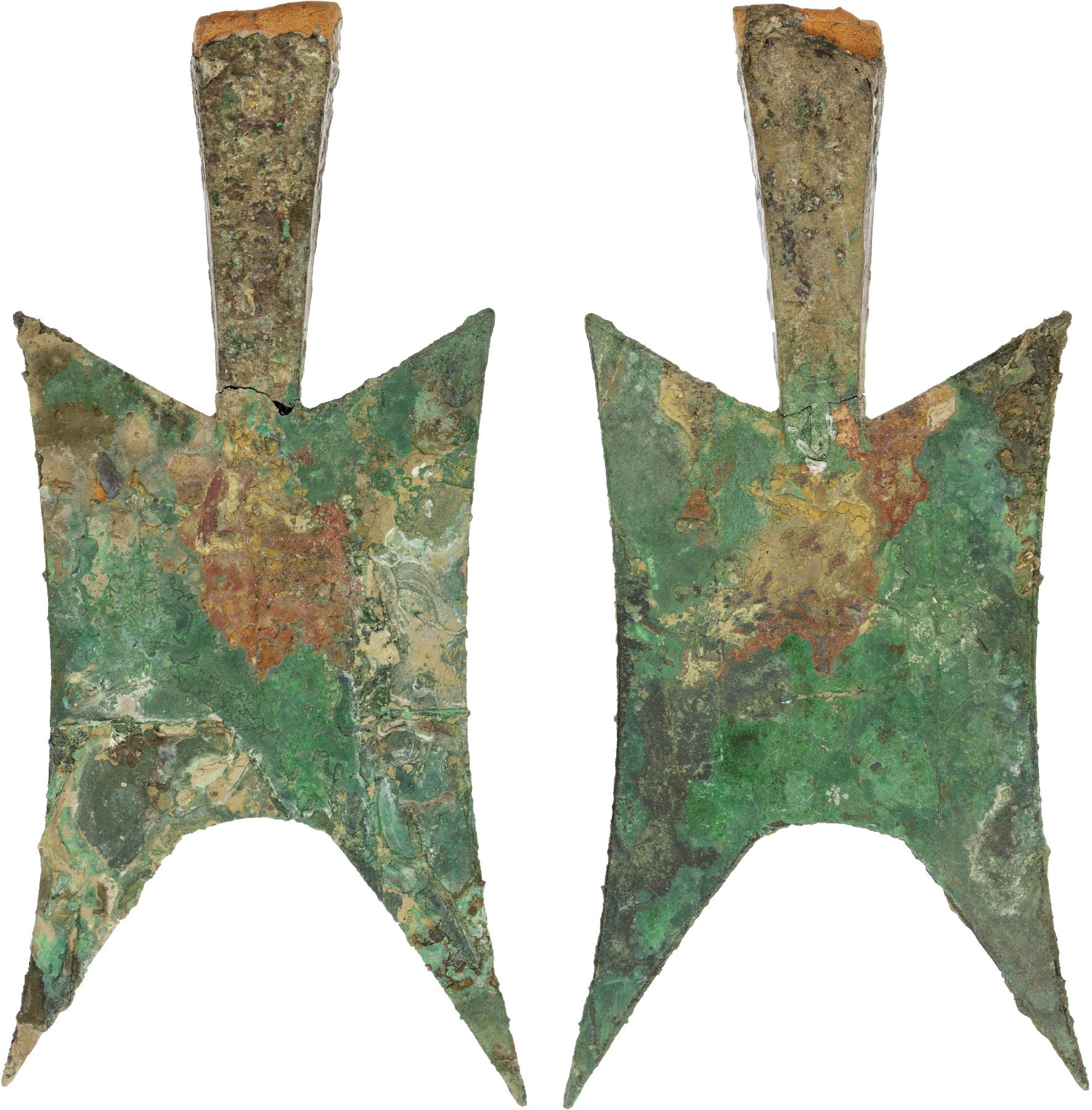 This type of spade has pointed shoulders and feet and a long hollow handle. There are three parallel lines on the obverse and reverse with occasional inscriptions. They are found in Northeast Henan and Shanxi Provinces, the territory of the Duchy of Jin, later to become the State of Zhao. They are held to be somewhat later in date than the square-shouldered spades. Their shape seems to be designed for ease of tying together in bundles, rather than deriving from any particular agricultural instrument.
