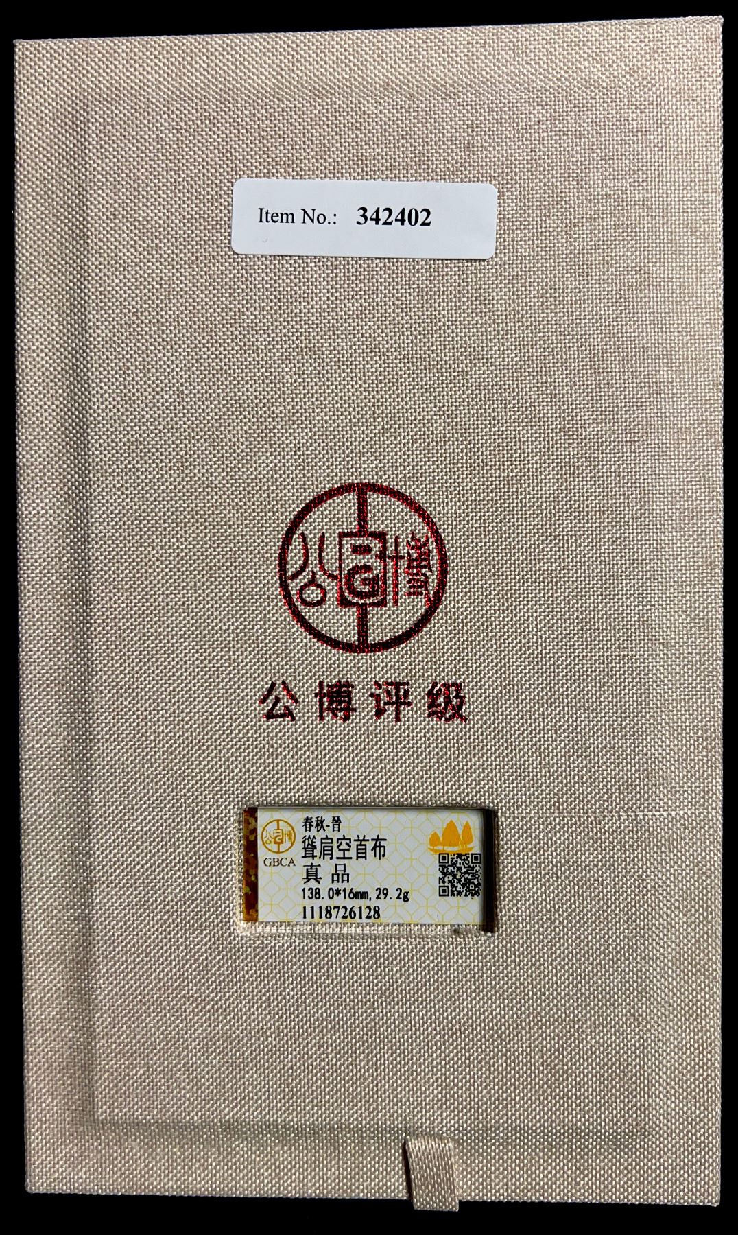 WARRING STATES: State of Jin, 500-400 BC, AE spade money (29.2g), H-2.182, hollow-handled pointed shoulder type, without inscription, graded 'Genuine' by GBCA Grading Company, broken at the neck and, usual green and light brown patina, VF, ex Dr. Dirk Löer Collection, ex Beijing Poly Auction 8th Anniversary Spring Auction, Lot 10639 (3788).
