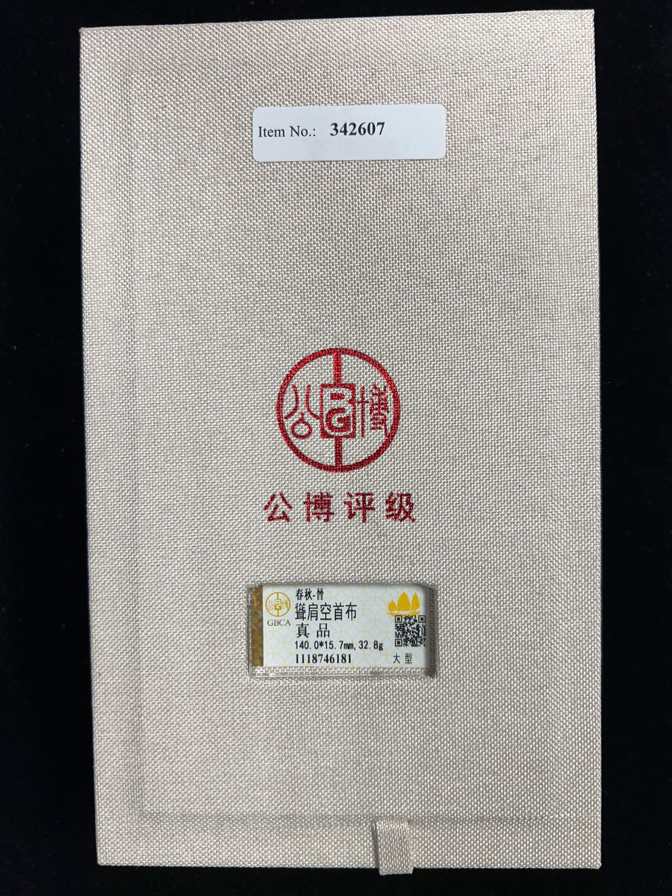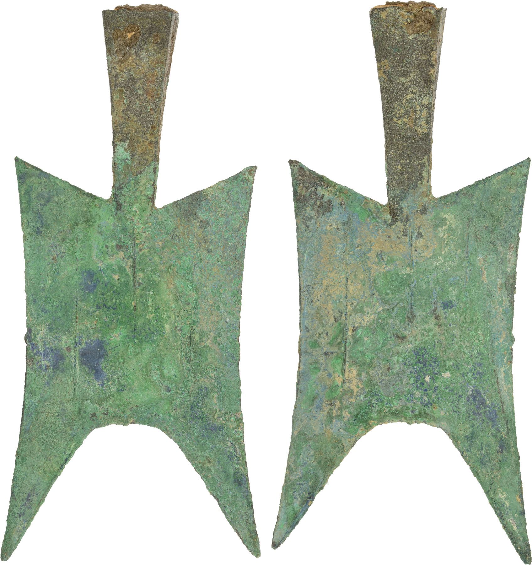 WARRING STATES: State of Jin, 500-400 BC, AE spade money (32.8g), H-2.181, hollow-handled pointed shoulder type, large uninscribed variety, a superb example with attractive patina! graded 'genuine' by GBCA Grading Company, VF, ex Dr. Dirk Löer Collection. Spades of this type are found in Northeast Henan and Shanxi, the territory of the Duchy of Jin, later to become Zhao. They are held to be somewhat later in date than the square shouldered spades. Their shape seems to be designed for ease of tying together in bundles, rather than deriving from any particular agricultural instrument.