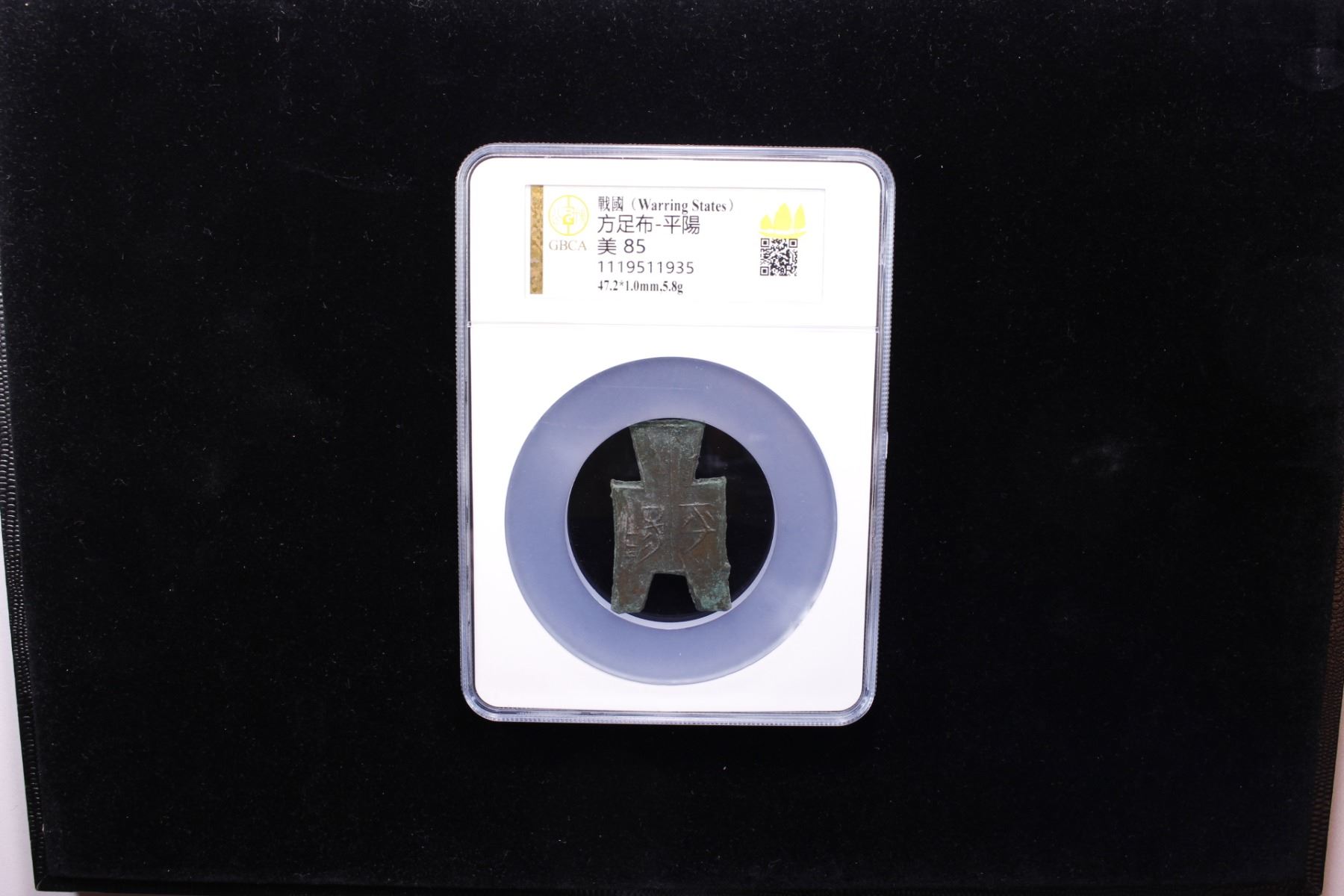 WARRING STATES: State of Liang, 350-250 BC, AE spade money (5.8g), H-3.357, flat-handle square-foot spade type, ping yang in archaic script, graded 85 by GBCA Grading Company, VF-XF. Possibly issued by the Zhao State.