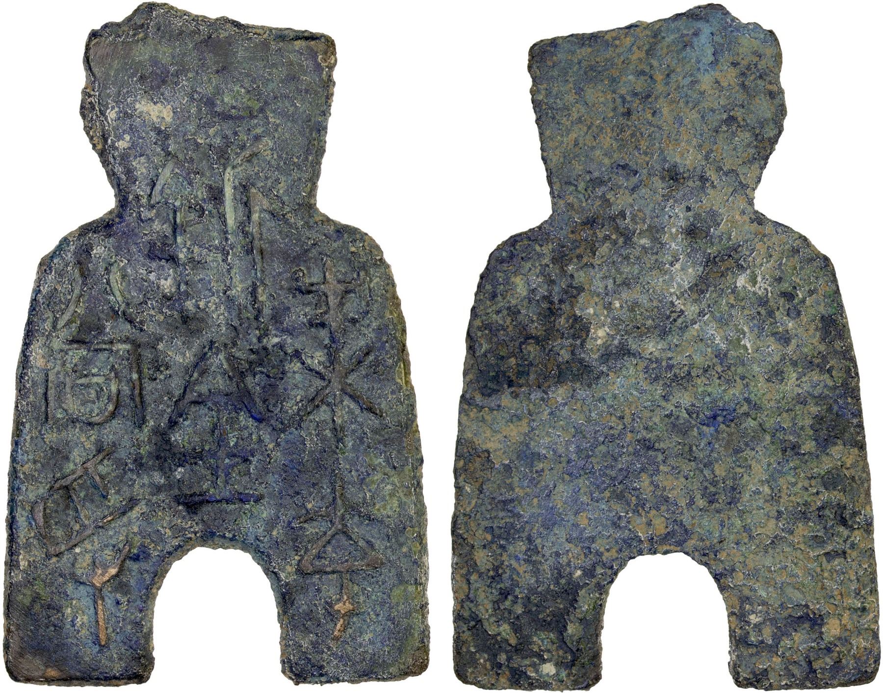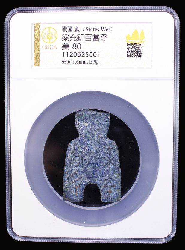 WARRING STATES: State of Liang, 400-300 BC, AE spade money (13.9g), H-3.46, flat-handled arched-foot type, liang zheng bi bai dang lie in archaic script (one of three current proposed readings of this inscription), graded 80 by GBCA Grading Company, VF, ex Dr. Dirk Löer Collection.