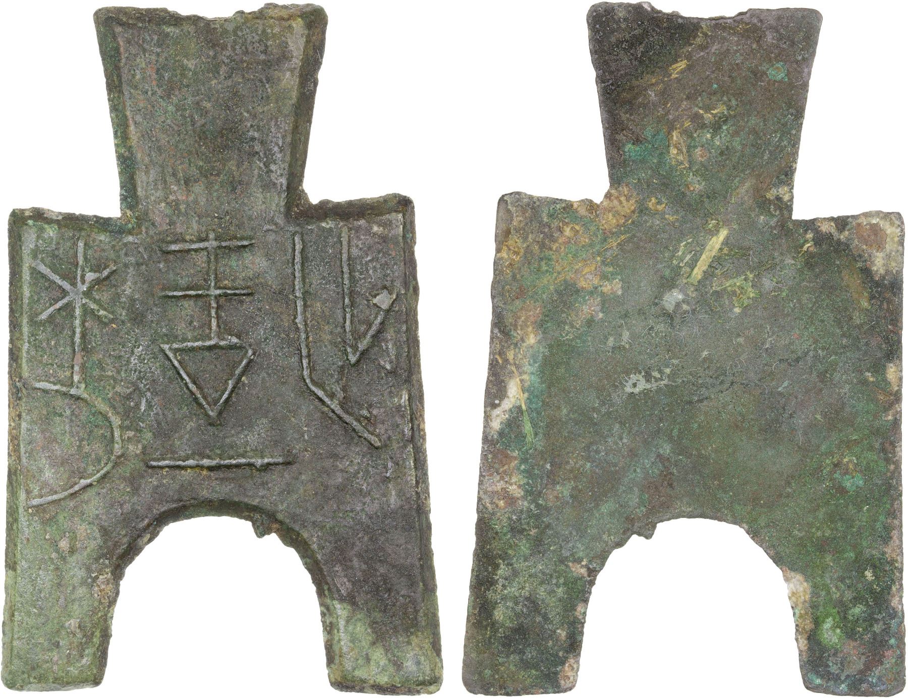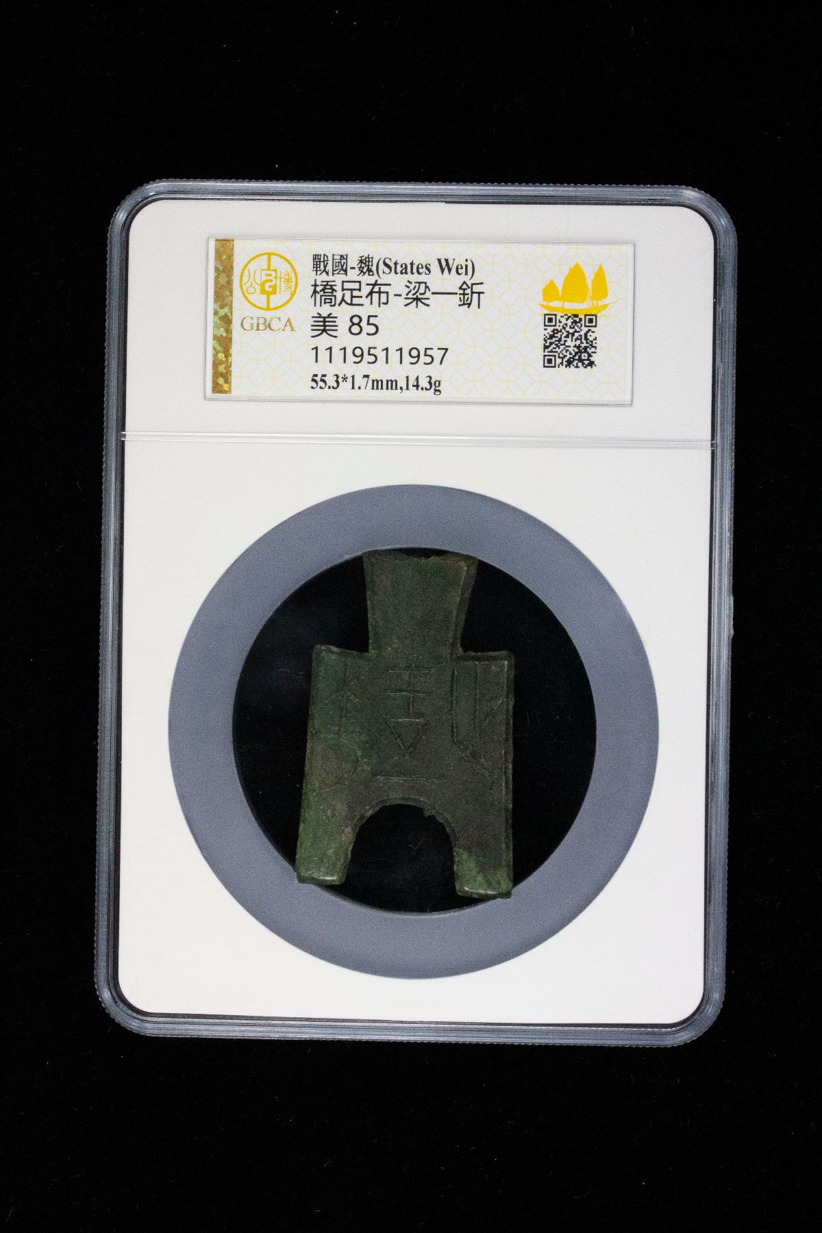 WARRING STATES: State of Liang, 400-300 BC, AE spade money (14.3g), H-3.22, flat-handled arched foot type, liang yi jin in archaic script, large planchet, graded 85 by GBCA Grading Company, VF-XF, ex Dr. Dirk Löer Collection. Arched foot spaces are associated with the State of Liang (also known as Wei), which flourished between 403 and 225 BC, and the State of Han (403-230 BC).