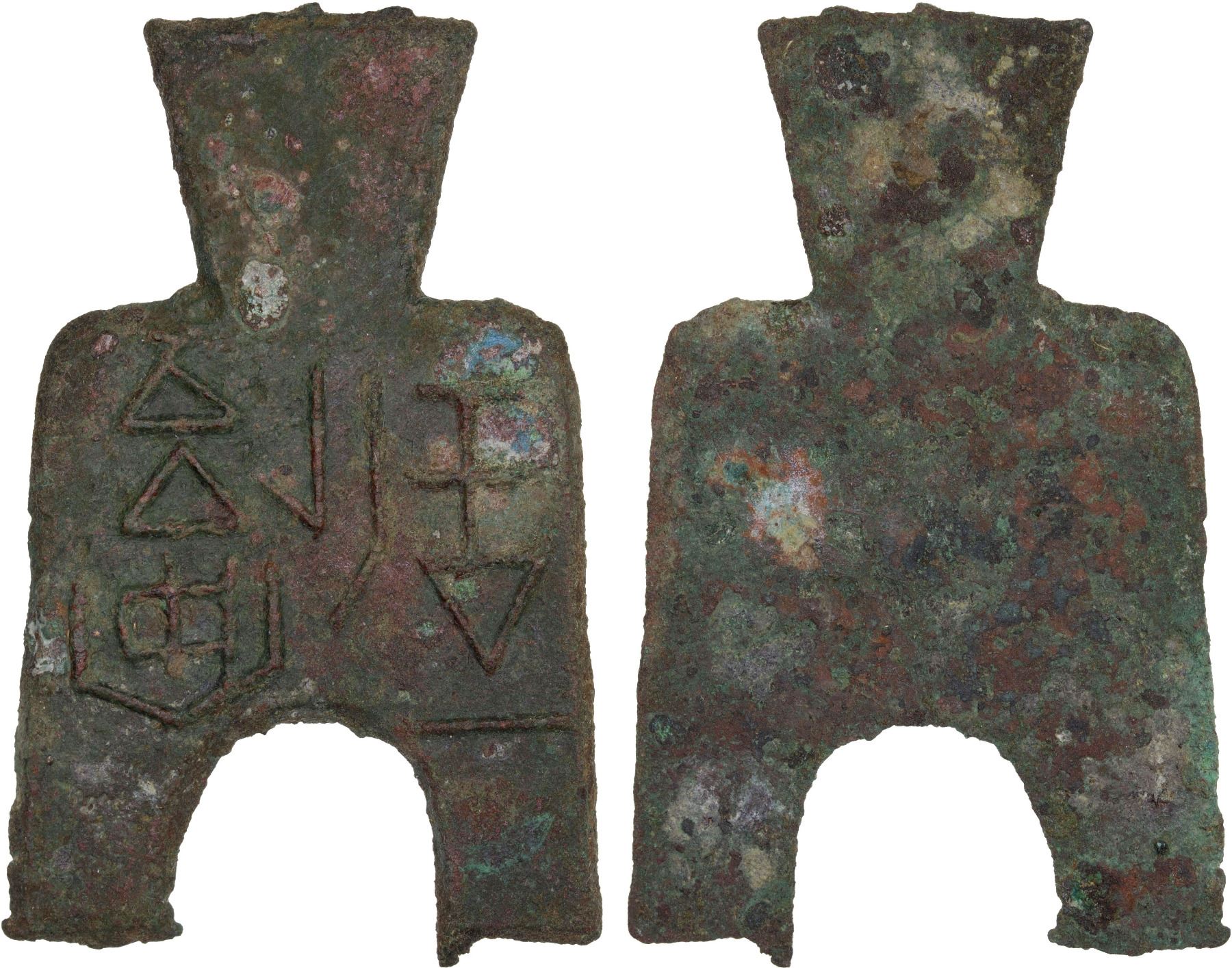 WARRING STATES: State of Liang, 400-300 BC, AE spade money (14.5g), H-3.8, flat-handled arched foot type, an yi yi jin ([City of] Anyi, [value] one jin) in inverted archaic script, graded 82 by GBCA Grading Company, VF, ex Dr. Dirk Löer Collection. Spades of this type have an arched crutch like an inverted U. The shoulders can be rounded or angular. Denominations of half, one, or two jin are normally specified. Arched foot spaces are associated with the State of Liang (also known as Wei), which flourished between 403 and 225 BC, and the State of Han (403-230 BC).