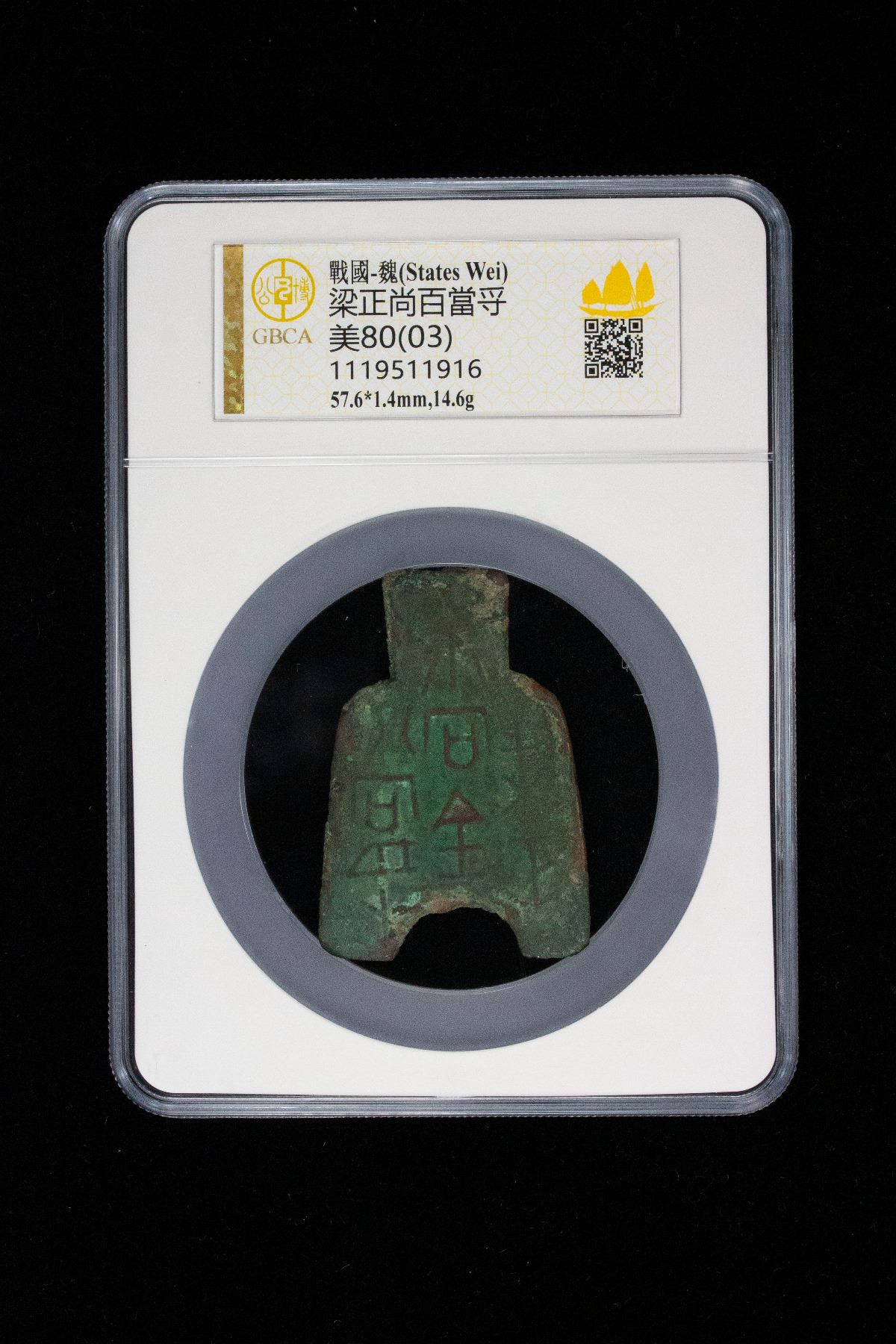 WARRING STATES: State of Liang, 400-300 BC, AE spade money (14.6g), H-3.44, flat-handled arched foot type, cheng zheng shang jin dang huan in archaic script, encrustation, graded 80(03) by GBCA Grading Company, repaired, VF, ex Dr. Dirk Löer Collection.