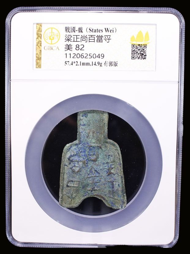 WARRING STATES: State of Liang, 400-300 BC, AE spade money (14.9g), H-3.45, flat-handled spade, cheng zheng shang jin dang huan in archaic script, encrustation, graded 82 by GBCA Grading Company, VF-XF.