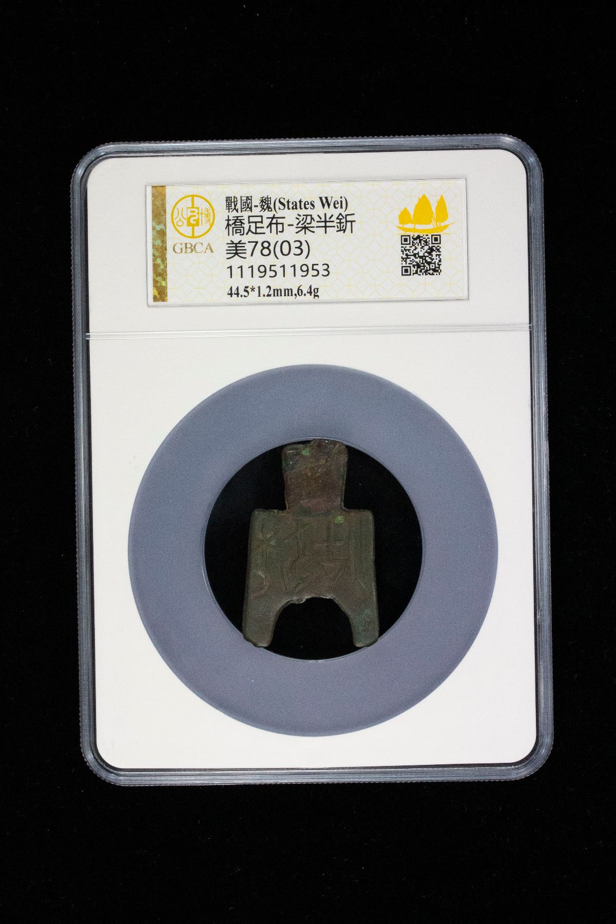 WARRING STATES: State of Liang, 400-300 BC, AE spade money (6.4g), H-3.21, flat-handled arched foot type, liang ban jin in inverted archaic script, graded 78(03) by GBCA Grading Company, repaired, VF, ex Dr. Dirk Löer Collection, ex Poly Auction Beijing 13, Lot 4456. Arched foot spaces are associated with the State of Liang (also known as Wei), which flourished between 403 and 225 BC, and the State of Han (403-230 BC).