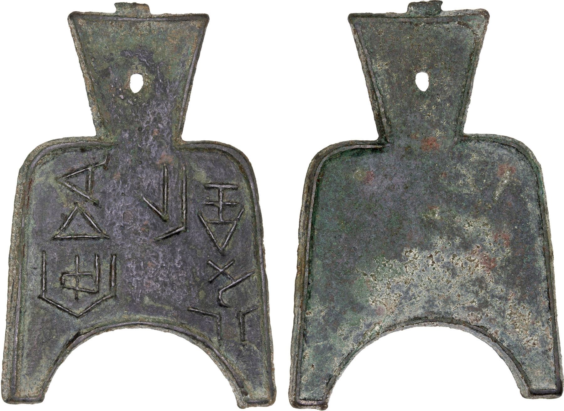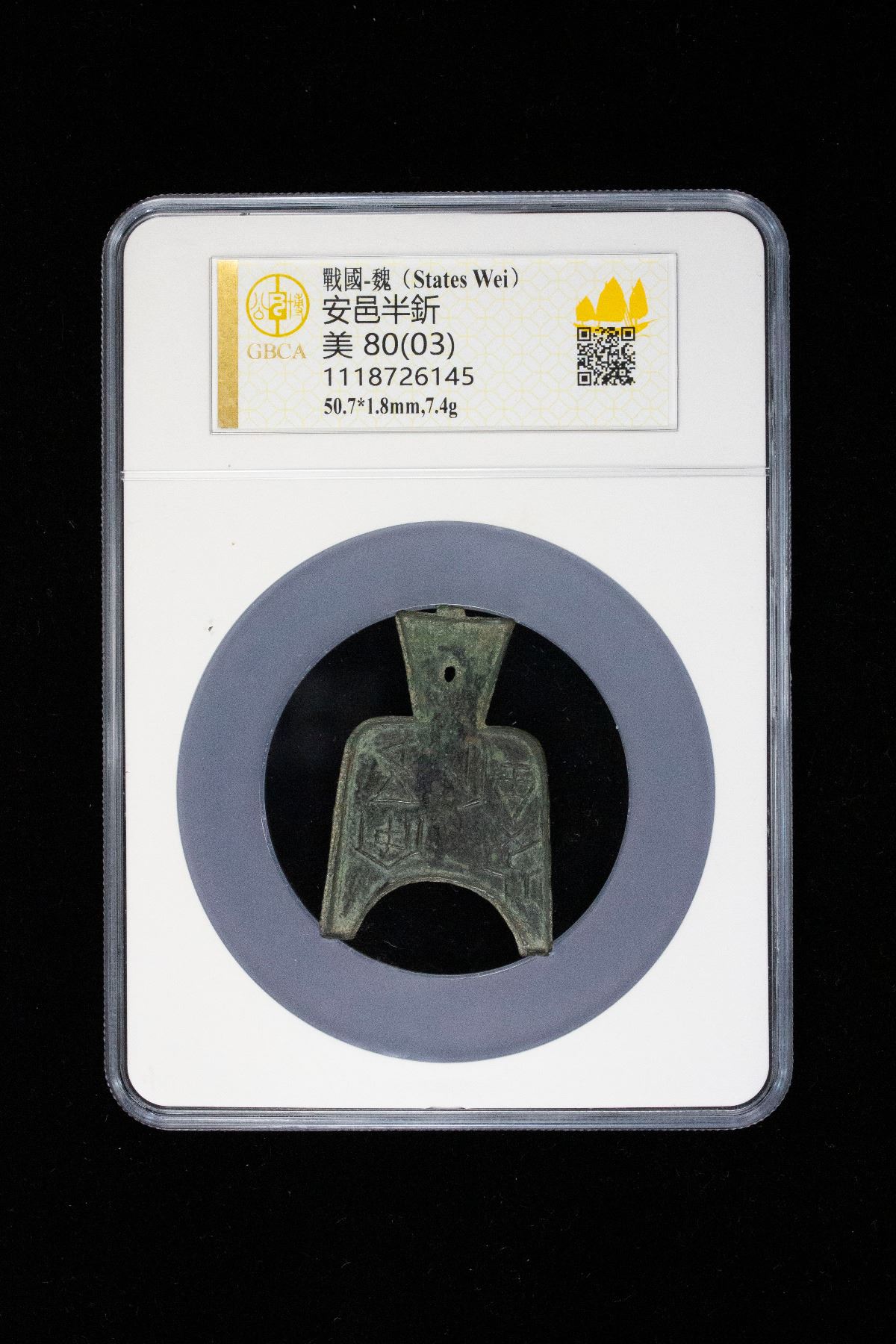 WARRING STATES: State of Liang, 400-300 BC, AE spade money (7.4g), An Yi, H-3.1, flat-handled arched foot type, an yi ban jin ([City of] Anyi, [value] half jin) in archaic script, graded 80(03) by GBCA Grading Company, repaired, VF, ex Dr. Dirk Löer Collection, ex Beijing Poly Auction Lot 4677. Located in today's Xia County in southern Shanxi, Anyi was the capital city of the State of Wei, which flourished between 403 and 225 BC. This state was also called the State of Liang after its capital was moved to Daliang in today's Kaifeng, Henan ca. 364 BC. Arched foot spades are associated with this state, as well as the State of Han (403-230 BC).