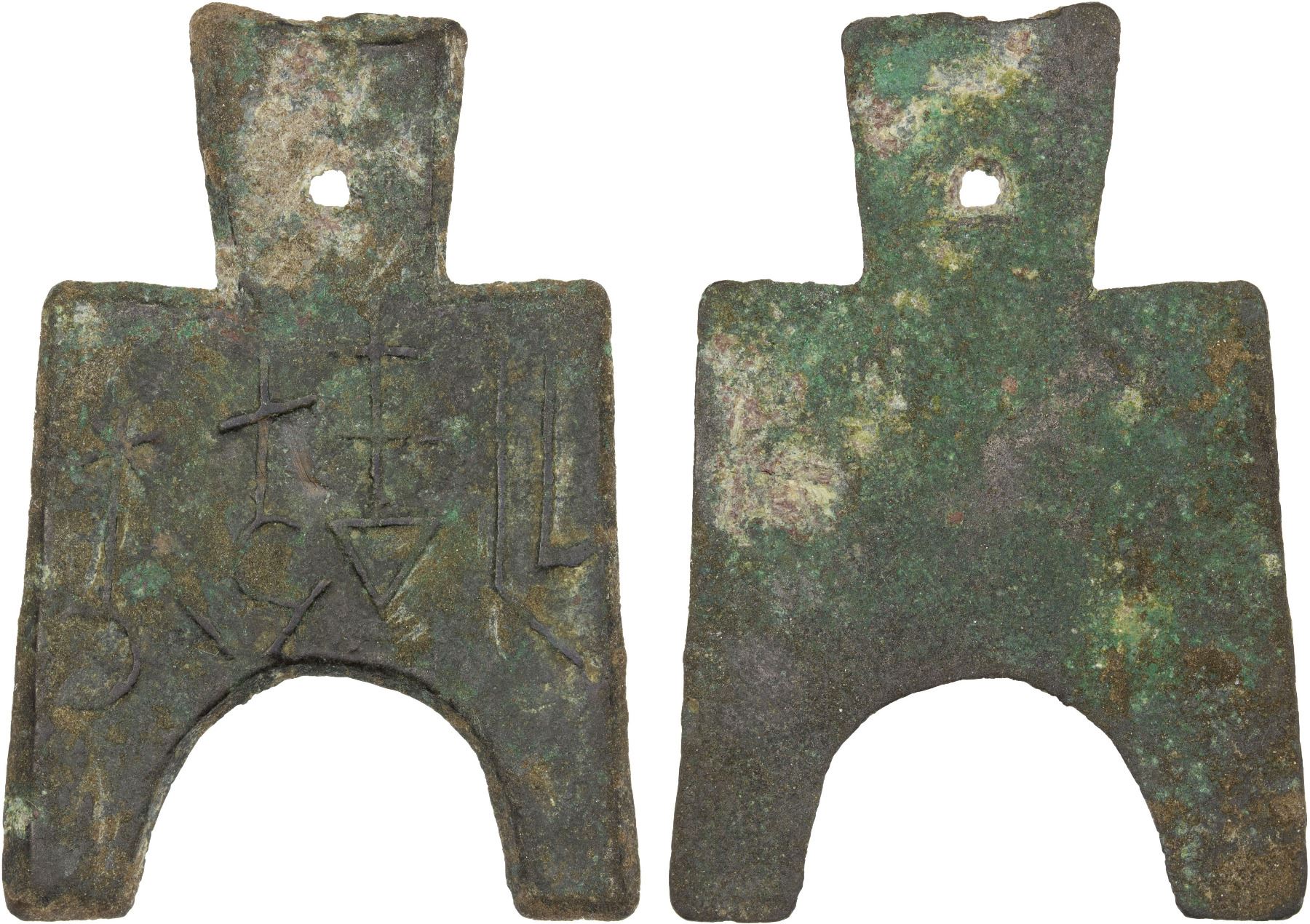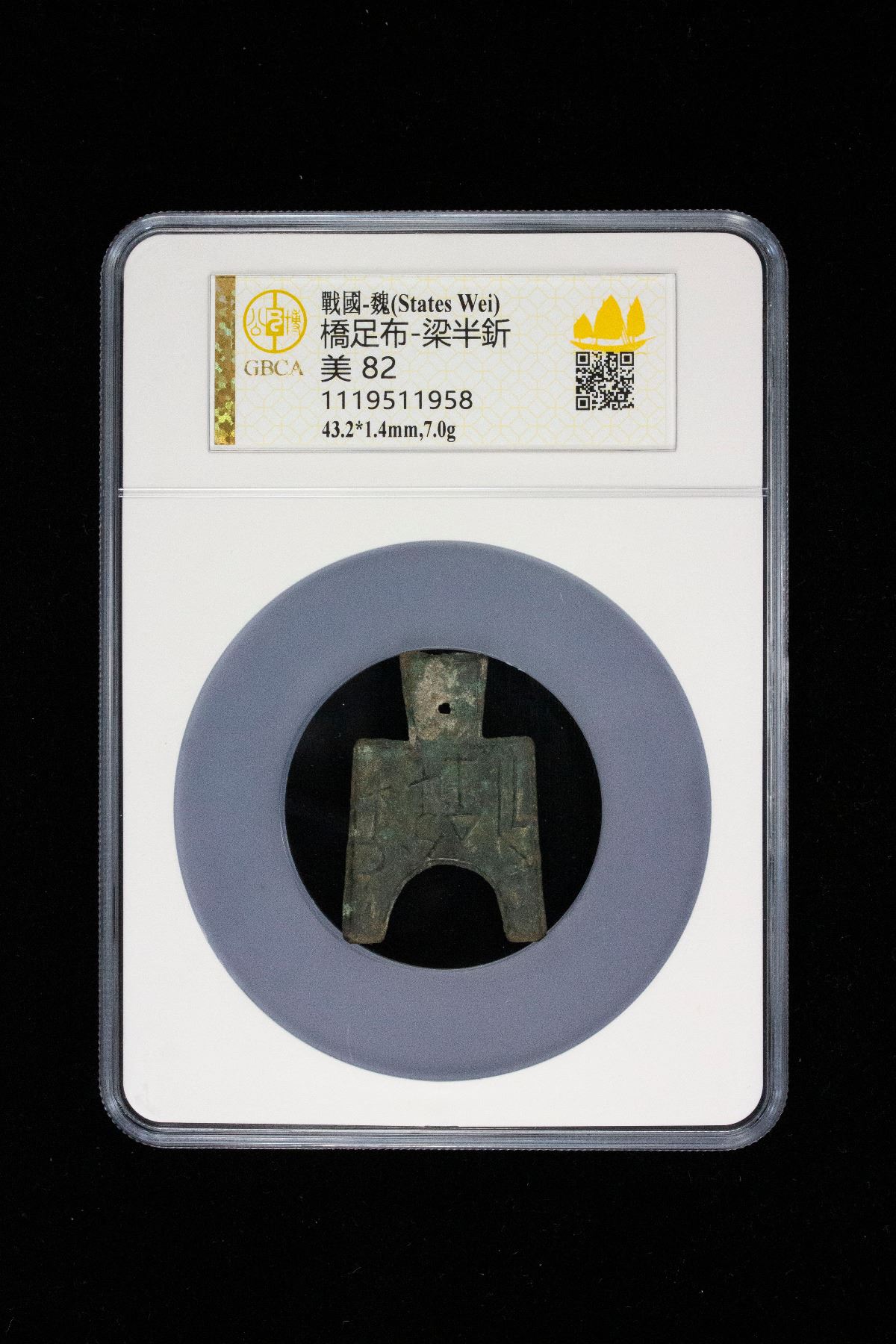 WARRING STATES: State of Liang, 400-300 BC, AE spade money (7g), H-3.21, flat-handled arched foot type, liang ban jin in archaic script, graded 82 by GBCA Grading Company, holed as made, VF, ex Dr. Dirk Löer Collection. Arched foot spaces are associated with the State of Liang (also known as Wei), which flourished between 403 and 225 BC, and the State of Han (403-230 BC).