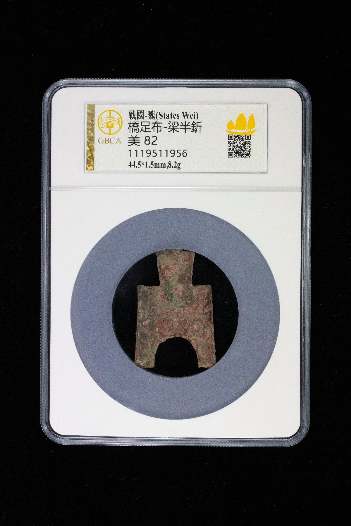 WARRING STATES: State of Liang, 400-300 BC, AE spade money (8.2g), H-3.21, flat-handled arched foot type, liang ban jin in archaic script, graded 82 by GBCA Grading Company, tiny natural casting hole, encrusted, VF, ex Dr. Dirk Löer Collection, ex Poly Auction Beijing 14, Lot 0755. Arched foot spaces are associated with the State of Liang (also known as Wei), which flourished between 403 and 225 BC, and the State of Han (403-230 BC).