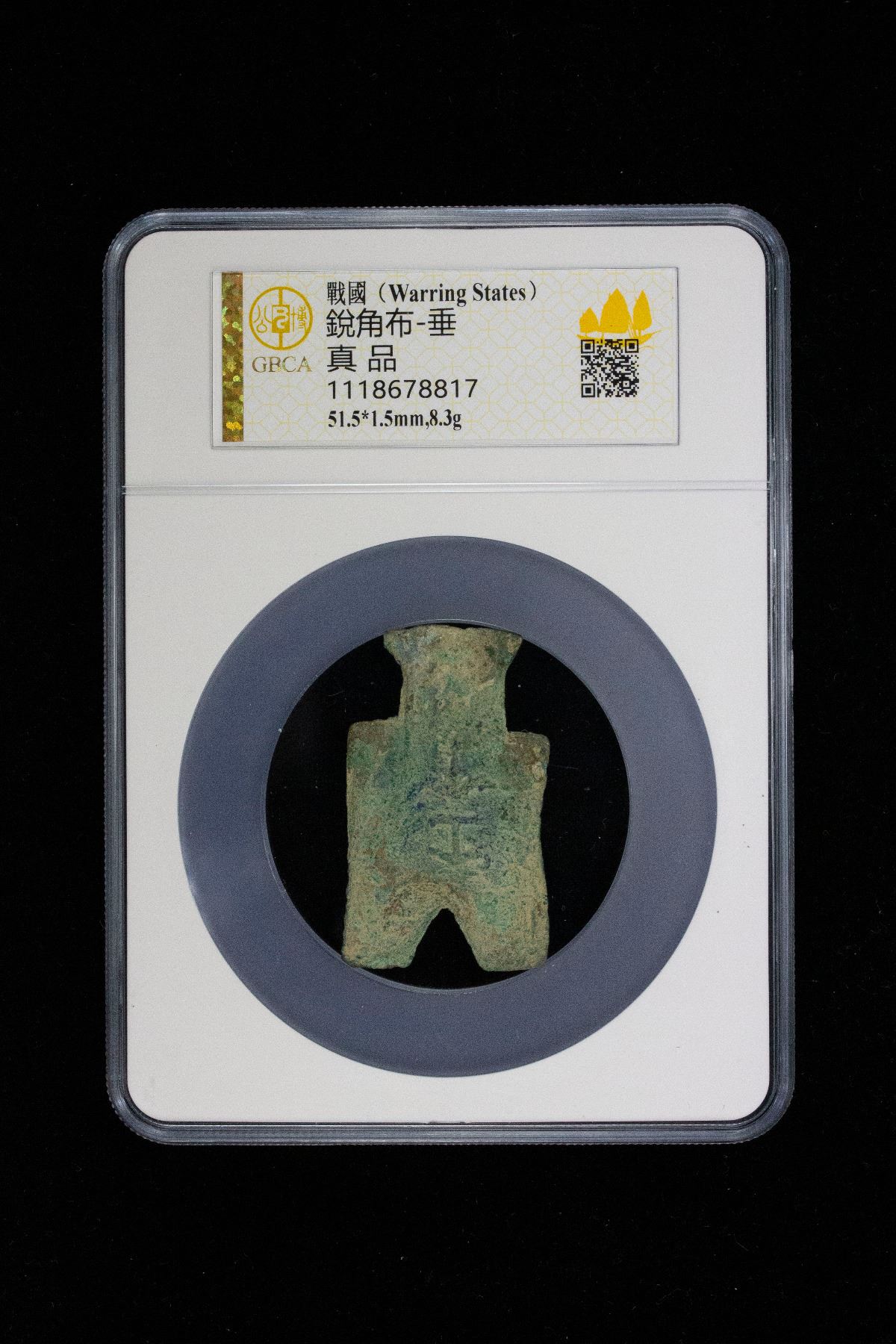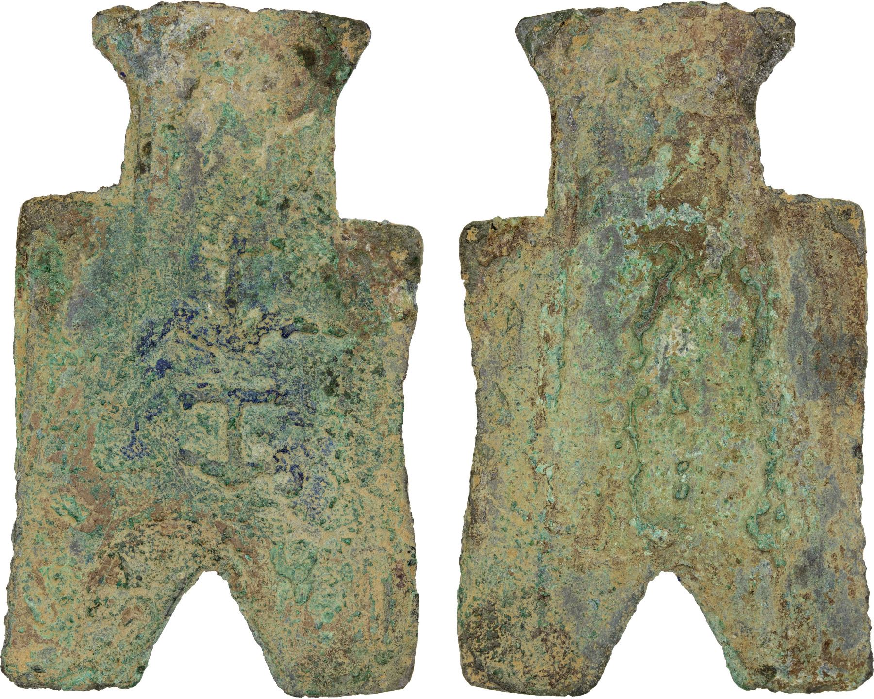 WARRING STATES: State of Liang/Han, AE spade money (8.3g), H-3.174, flat-handled sharp-cornered type, chui in archaic script, graded 'Genuine' by GBCA Grading Company, attractive patina, F-VF, ex Dr. Dirk Löer Collection. Sharp cornered spades form a distinct sub-series of the square foot spades. They differ slightly from the normal type as they have small triangular projections on the handle. Their find spots correspond with the states of Liang and Han. See www.chnmuseum.cn/zp/zpml/201812/t20181218_23277.shtml for a tentative attribution.