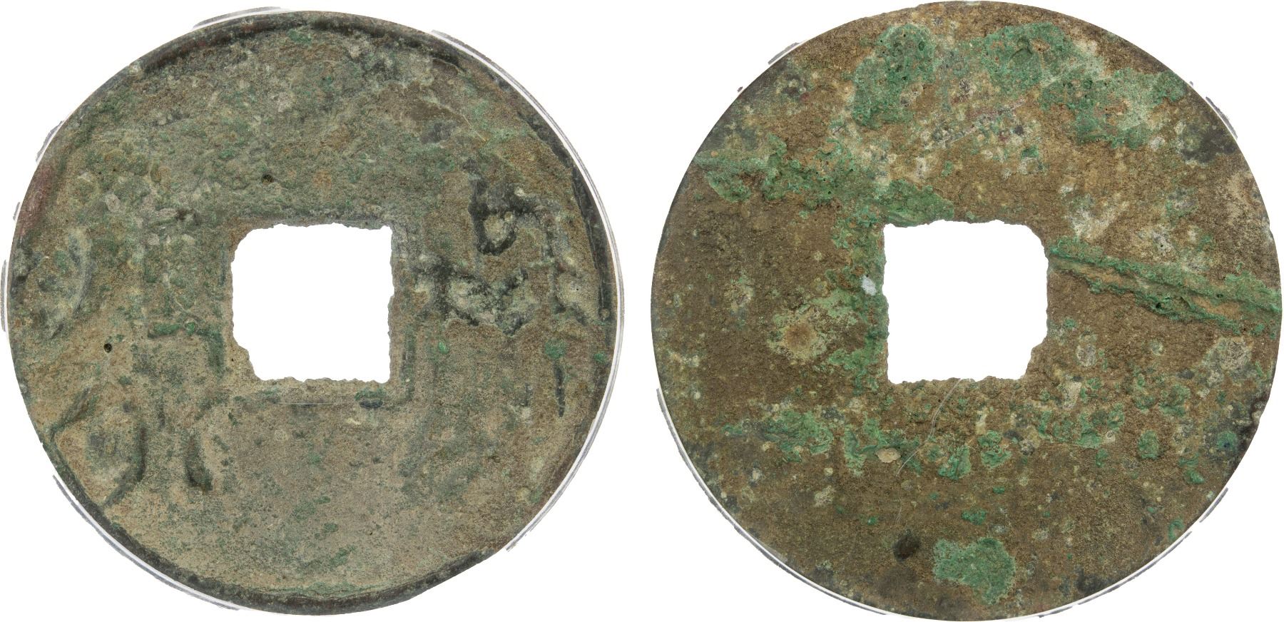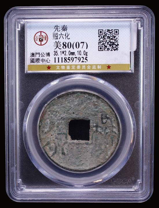 WARRING STATES: State of Qi, 300-220 BC, AE cash (10g), H-6.25, yi liu huo ([City of] Yi, currency of [value] six) in archaic characters, graded 80(07) by GBCA Grading Company, natural casting defects, Fine.