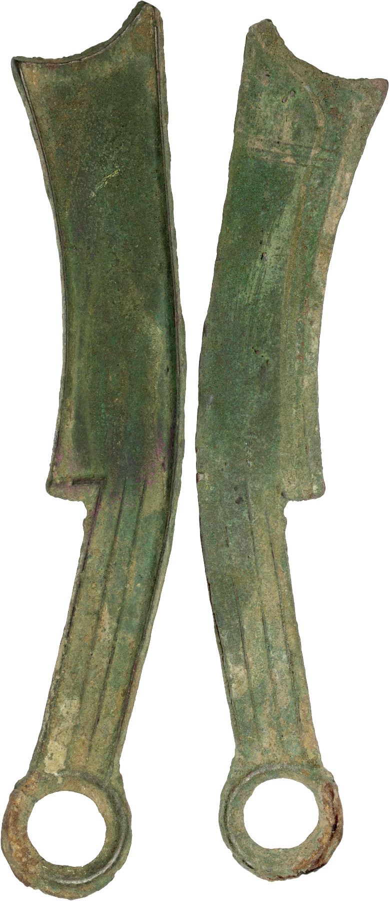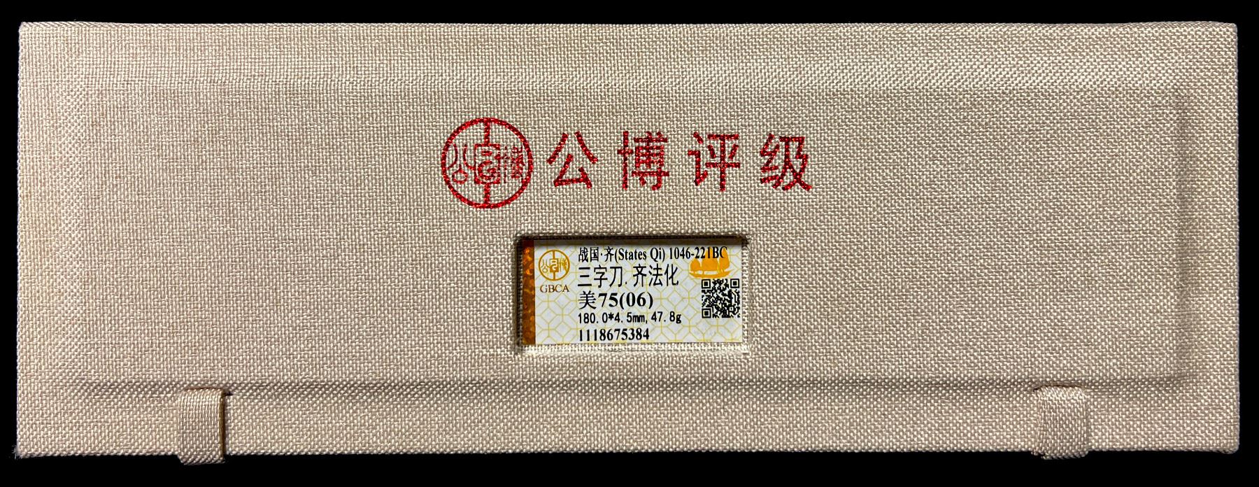WARRING STATES: State of Qi, 400-220 BC, AE knife money (47.8g), H-4.6, three-character type, qi fa huo (the authorized currency of Qi) in archaic script on obverse, thin characters in high relief, attractive greenish patina, graded 75(06) by GBCA Grading Company, artificial defect, Fine, ex Dr. Dirk Löer Collection. The Qi Knife Money evolved from an ancient Chinese bronze implement with a ring at the end, this ancient knife was known as a xue. While knife money is shaped like a knife, the Qi Knives were never actually used as actual knives.