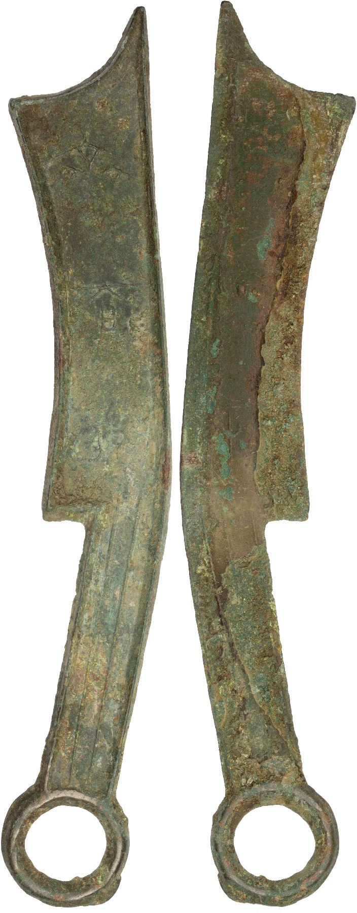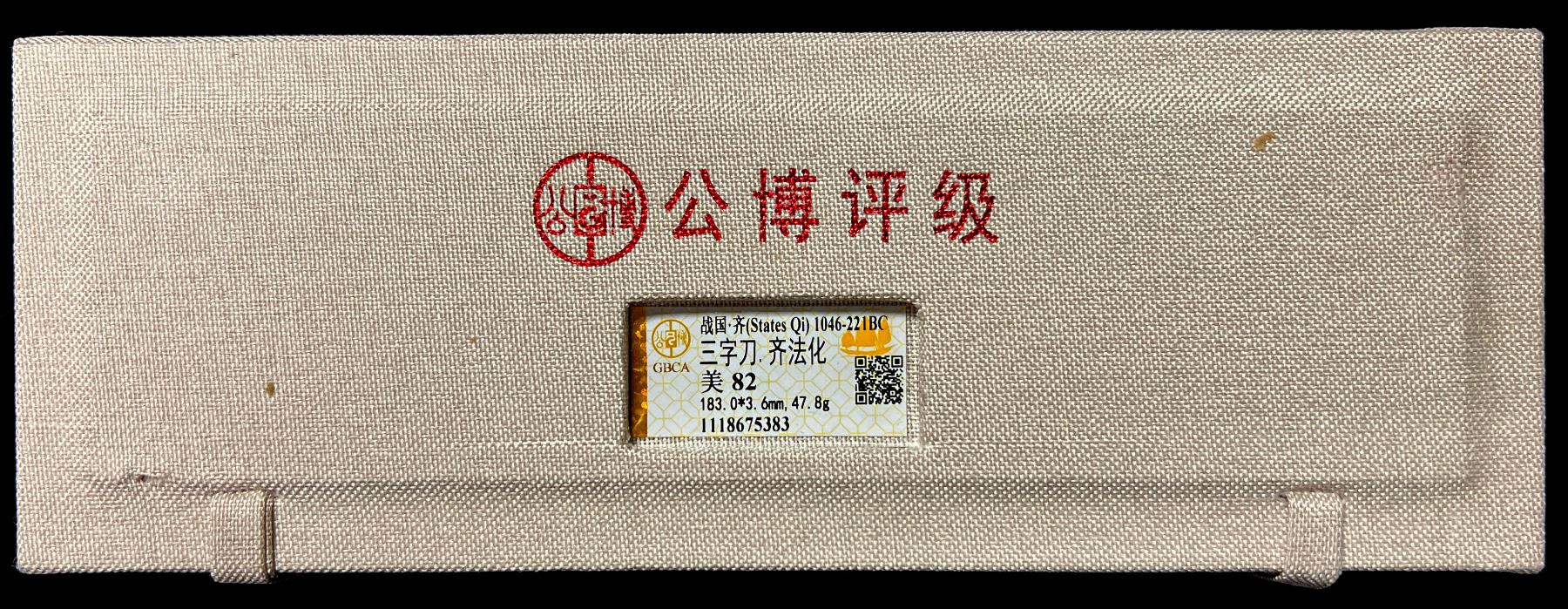 WARRING STATES: State of Qi, 400-220 BC, AE knife money (47.8g), H-4.7m, three-character type, qi fa huo (the authorized currency of Qi) in archaic script on obverse, thin characters in high relief, che on reverse, lovely greenish patina, graded 82 by GBCA Grading Company, VF, ex Dr. Dirk Löer Collection.