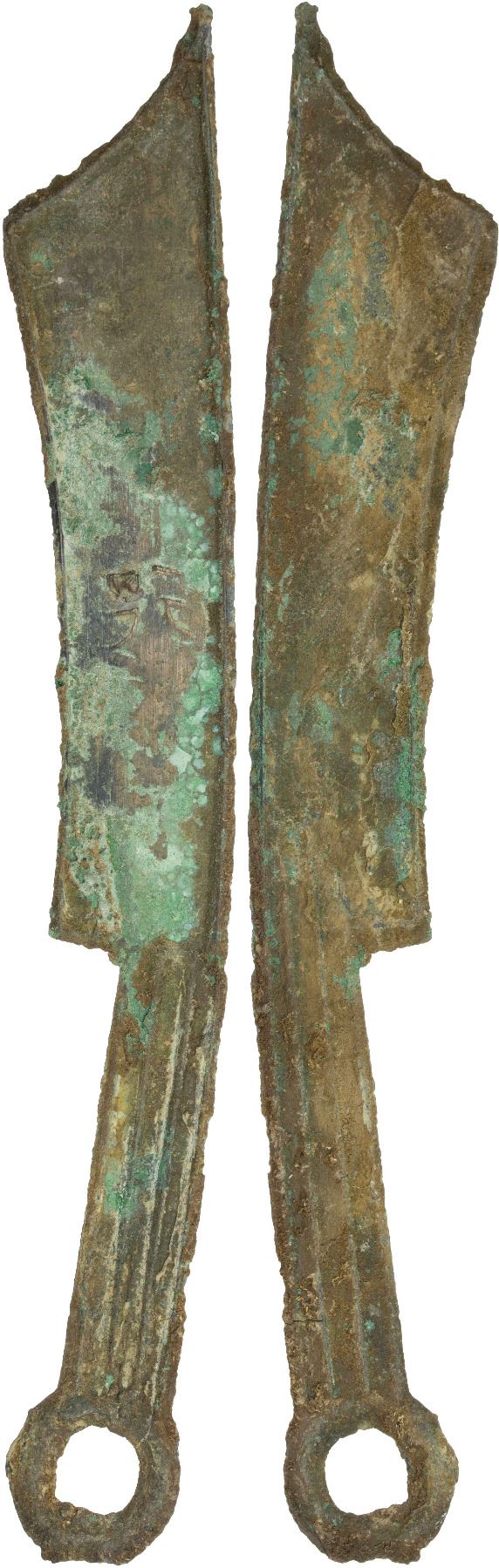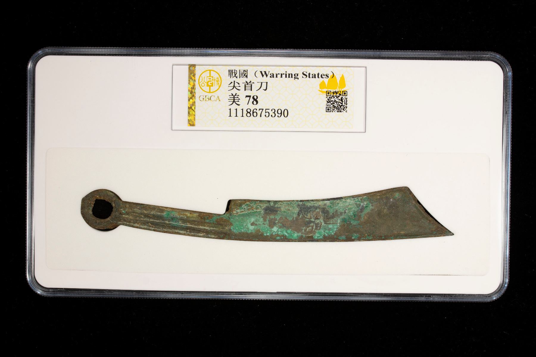 WARRING STATES: State of Yan, 400-200 BC, AE knife money, H-4.22v, pointed tip type, possibly archaic character xíng, graded 78 by GBCA Grading Company, VF, ex Dr. Dirk Löer Collection. The find spots of this type of knife money in the north-east of China associate it with the State of Yan. Over 160 different inscriptions have been recorded. Some inscriptions represent numbers or cyclical characters, but many have not been deciphered. Unlike the hollow handle spade money, the characters have not been generally associated with known places names.