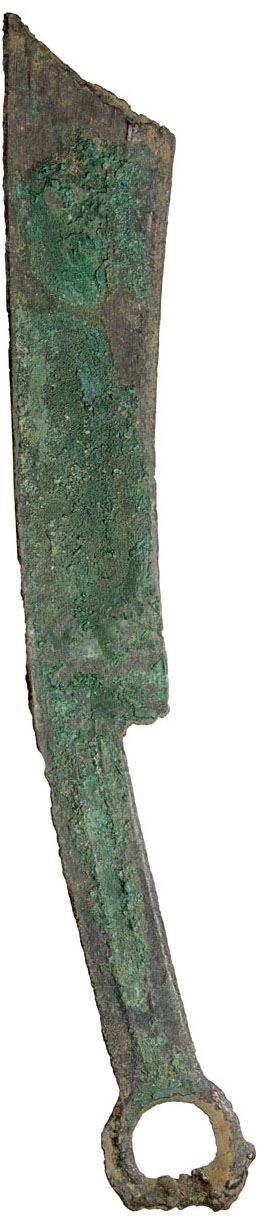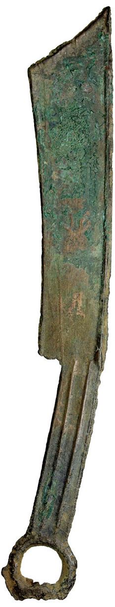 WARRING STATES: State of Yan, 600-400 BC, AE knife money (12.69g), H-4.16, 142mm length, pointed tip type, archaic character liu (six), attractive example with lovely patina! Fine to VF, ex Shawn Hamilton Collection.    Issued during the Spring and Autumn through the early Warring States periods.
