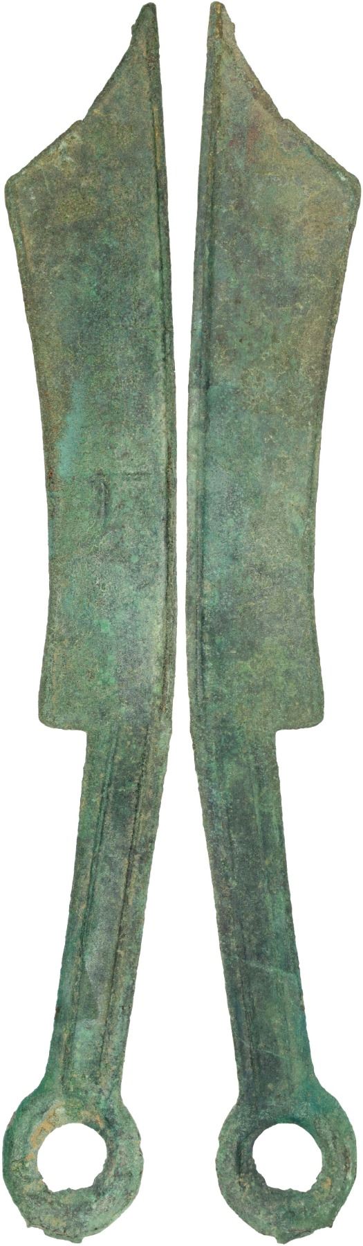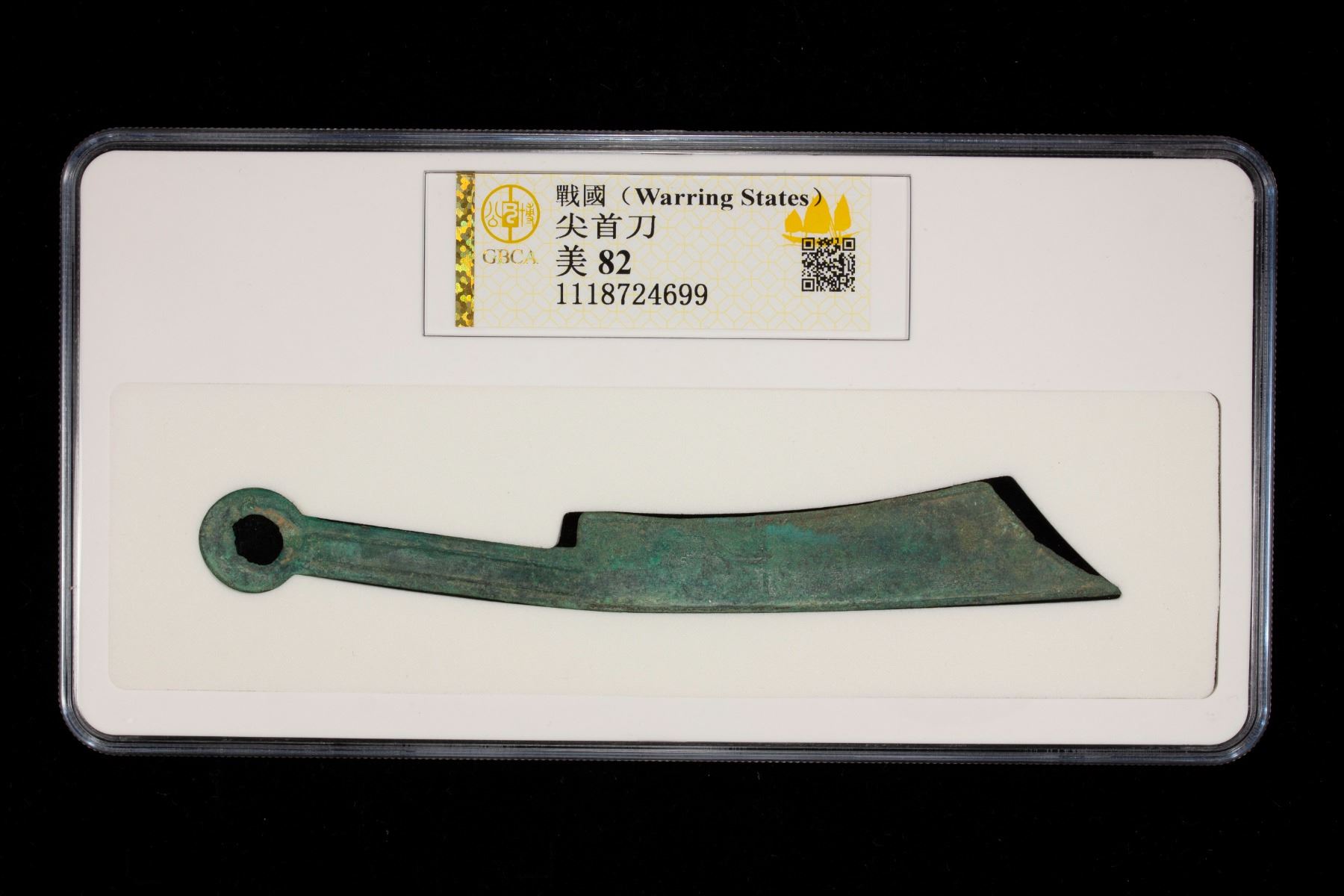 WARRING STATES: State of Yan, 600-400 BC, AE knife money, H-4.15v, pointed tip type, uncertain archaic character, graded 82 by GBCA Grading Company, an attractive example with lovely patina, VF, ex Dr. Dirk Löer Collection. Issued during the Spring and Autumn through the early Warring States periods.