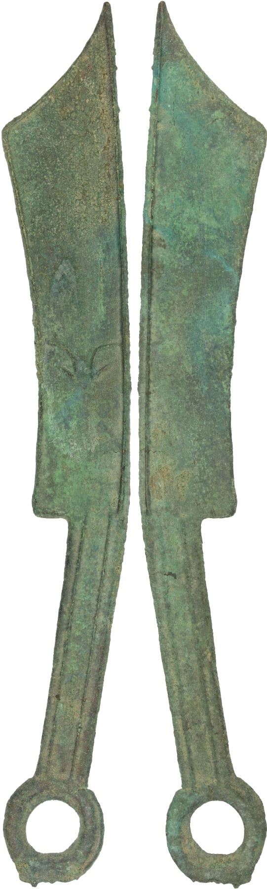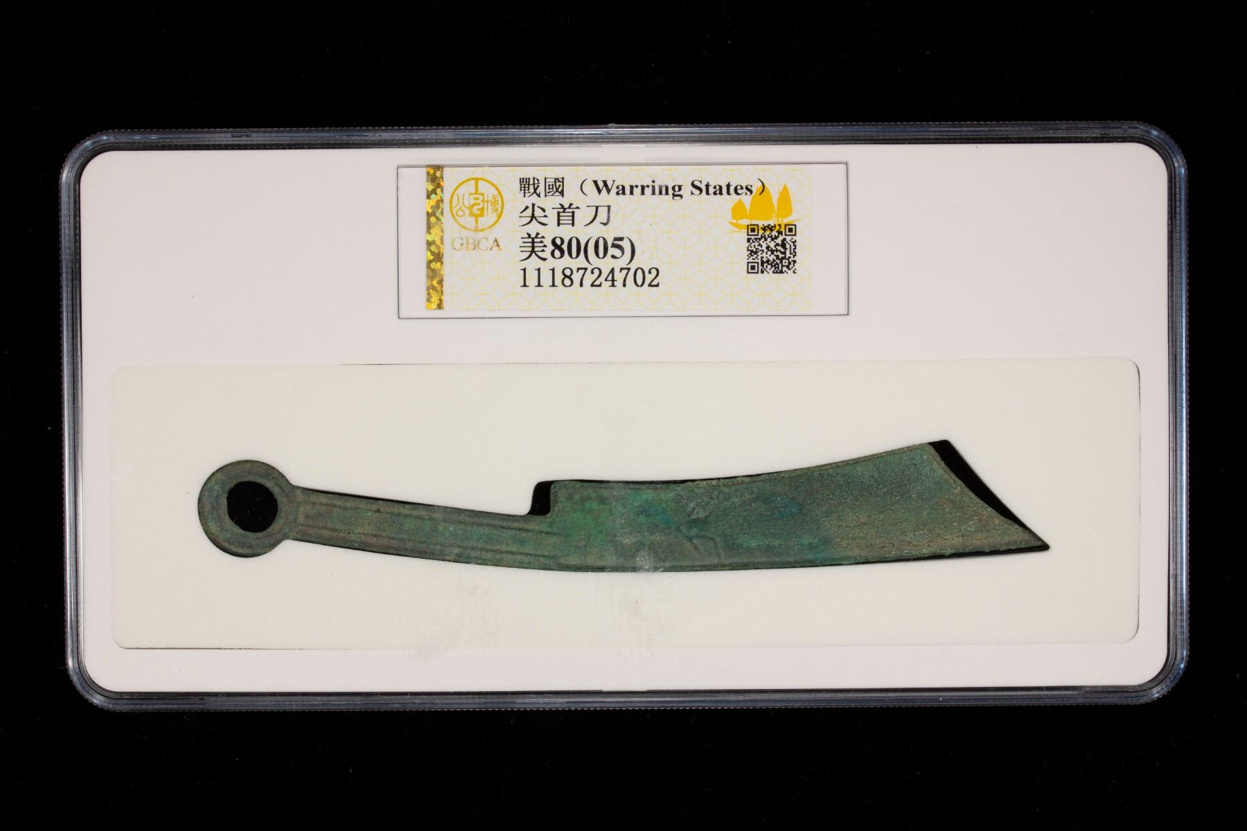 WARRING STATES: State of Yan, 600-400 BC, AE knife money, H-4.16, pointed tip type, character liu (six) in archaic script, graded 82(07) by GBCA Grading Company, natural casting defects, an attractive example with lovely patina, VF, ex Dr. Dirk Löer Collection. Issued during the Spring and Autumn through the early Warring States periods.