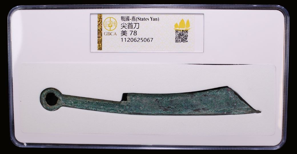 WARRING STATES: State of Yan, 600-400 BC, AE knife money, H-4.15var, pointed-tip type, with undeciphered character, graded 78 by GBCA Grading Company, VF, ex Bernd Löer Collection.