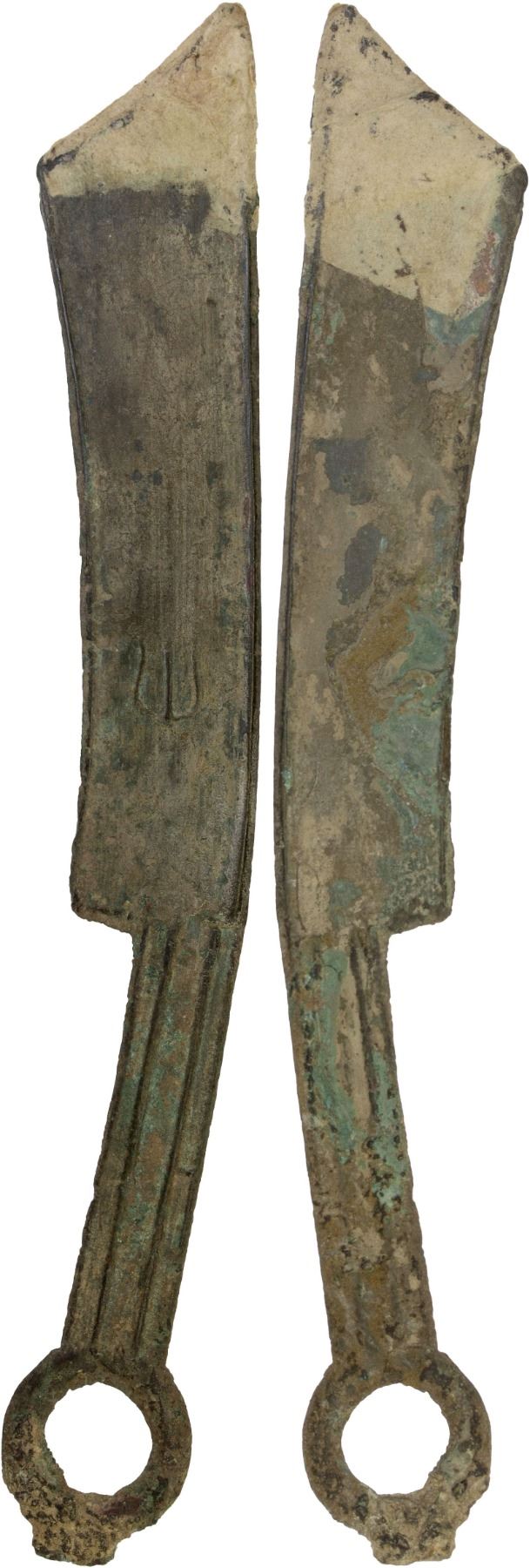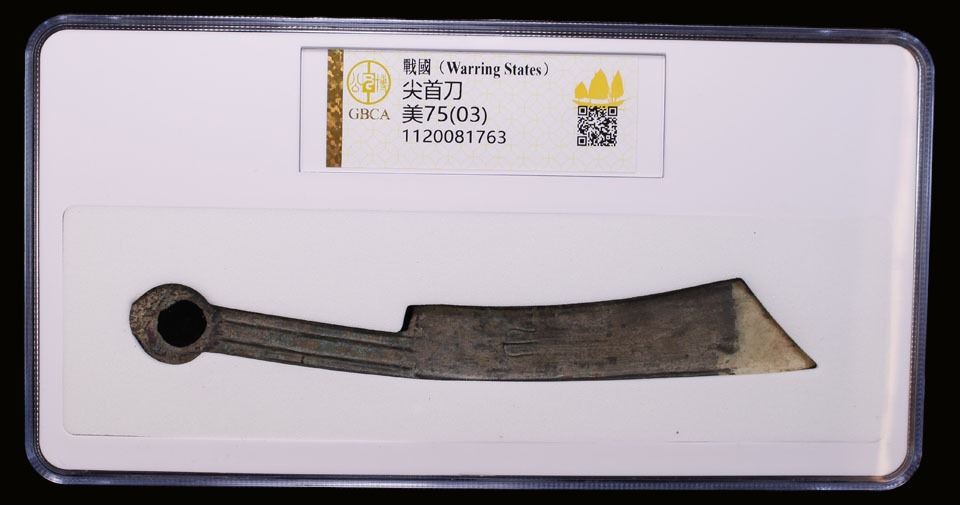 WARRING STATES: State of Yan, 600-400 BC, AE knife money, H-4.32var, pointed-tip type, uncertain archaic character, an attractive example with lovely patina, graded 75(03) by GBCA Grading Company, repaired, VF, ex Dr. Dirk Löer Collection.
