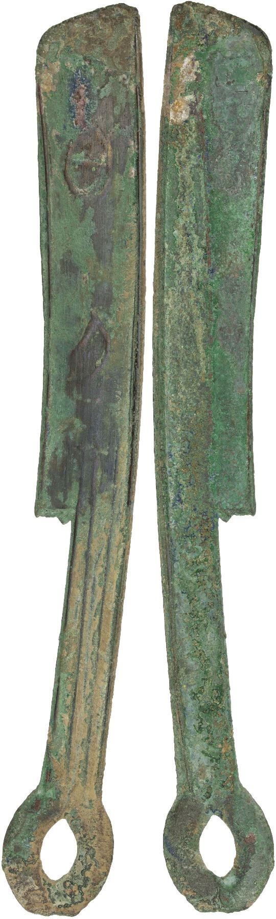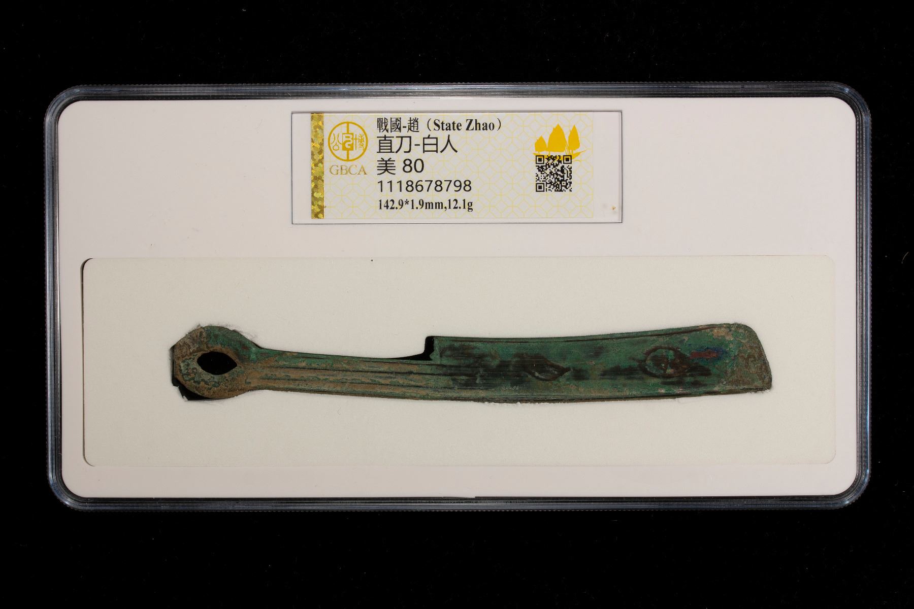 WARRING STATES: State of Zhao, 300-250 BC, AE knife money (12.1g), Bai Ren, H-4.60, straight tip type, archaic characters bai ren, graded 80 by GBCA Grading Company, F-VF, ex Dr. Dirk Löer Collection. Issued during the Spring and Autumn through the early Warring States periods. Bai Ren was an important city of the State of Zhao. Its ruins lie within today's Xingtai City in southern Hebei.