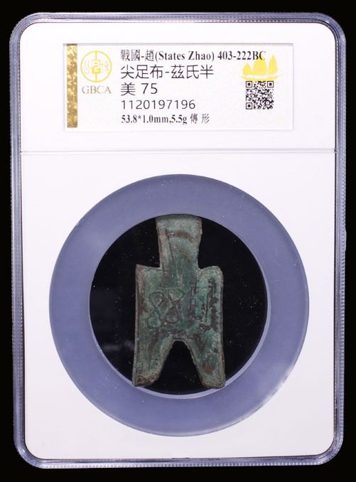 WARRING STATES: State of Zhao, 350-250 BC, AE spade money (5.5g), H-3.147, flat-handled pointed-foot type, reversed inscription zi shi ban in archaic script, graded 75 by GBCA Grading Company, with old collector's tag on reverse, VF, ex Ilse & Rolf Braun Collection.
