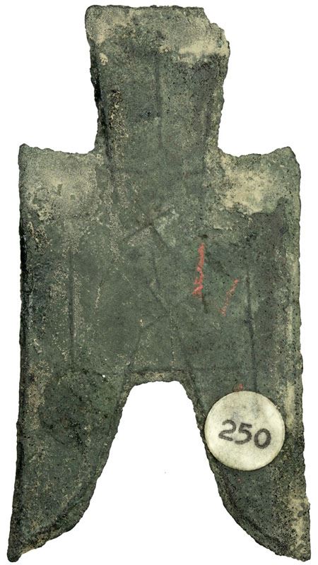 WARRING STATES: State of Zhao, ca. 350-250 BC, AE spade money (6.65g), H-3.145/6, flat handle pointed foot spade type, wu ping in archaic script, tiny chip at top left, Fine, ex Jiùjinshan Collection.