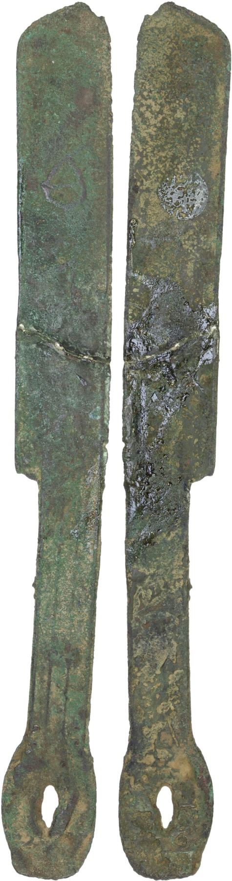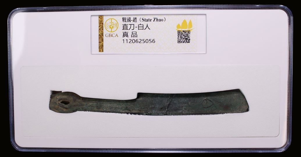 WARRING STATES: State of Zhou, 300-250 BC, AE knife money, H-4.60, straight tip Bai Ren type, graded 'Genuine' by GBCA Grading Company, VF, ex Bernd Löer Collection. Issued during the Spring and Autumn through the early Warring States periods.